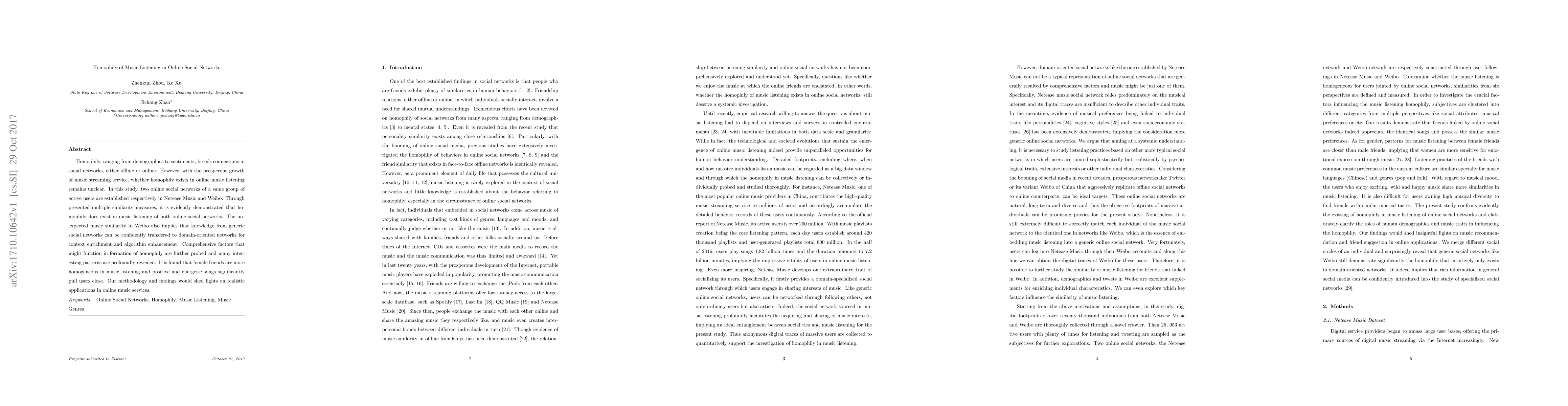 This study demonstrates that homophily exists in online music listening across social networks, showing users with similar music preferences tend to connect. Findings reveal that female friends exhibit higher musical homogeneity and that positive, energetic songs enhance user connections, providing insights for improving online music services.