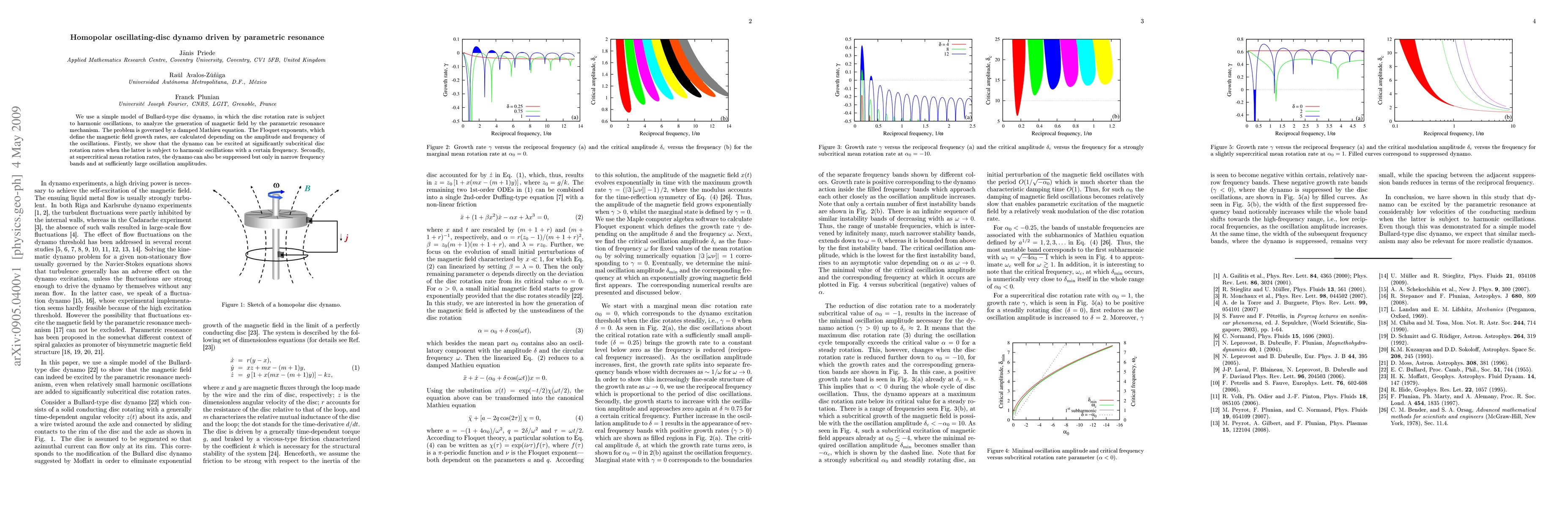 This paper explores a Bullard-type disc dynamo driven by parametric resonance, showing that harmonic oscillations can excite the dynamo at subcritical rotation rates and suppress it at supercritical rates within specific frequency bands and large oscillation amplitudes. The magnetic field growth rates are determined by the damped Mathieu equation.