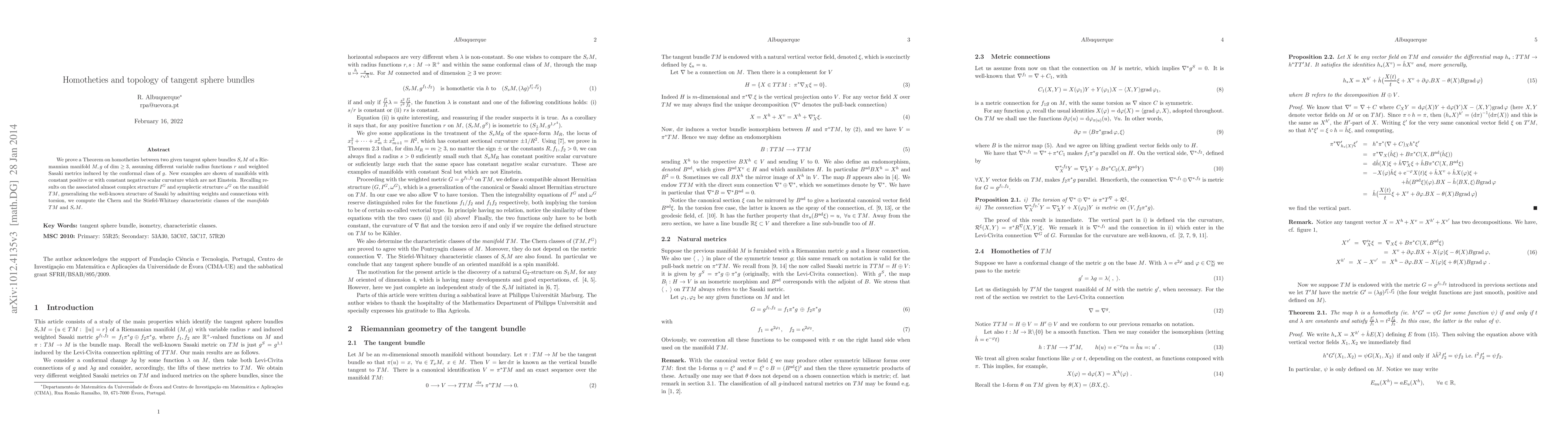We prove a Theorem on homotheties between two given tangent sphere bundles $S_rM$ of a Riemannian manifold $M,g$ of $\dim\geq 3$, assuming different variable radius functions $r$ and weighted Sasaki metrics induced by the conformal class of $g$. New examples are shown of manifolds with constant positive or with constant negative scalar curvature, which are not Einstein. Recalling results on the associated almost complex structure $I^G$ and symplectic structure ${\omega}^G$ on the manifold $TM$, generalizing the well-known structure of Sasaki by admitting weights and connections with torsion, we compute the Chern and the Stiefel-Whitney characteristic classes of the manifolds $TM$ and $S_rM$.