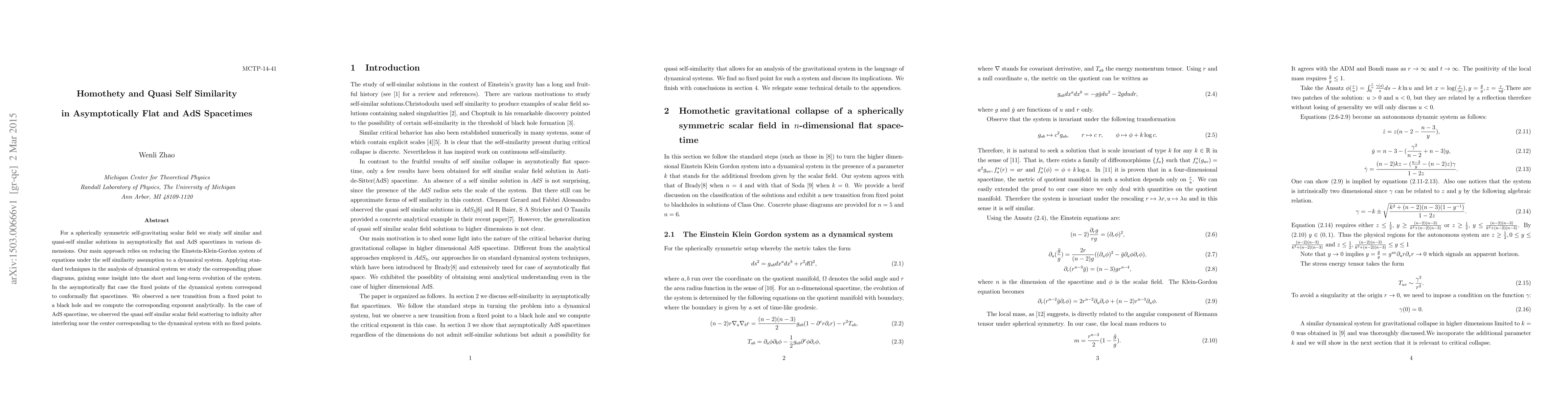For a spherically symmetric self-gravitating scalar field we study self similar and quasi-self similar solutions in asymptotically flat and AdS spacetimes in various dimensions. Our main approach relies on reducing the Einstein-Klein-Gordon system of equations under the self similarity assumption to a dynamical system. Applying standard techniques in the analysis of dynamical system we study the corresponding phase diagrams, gaining some insight into the short and long-term evolution of the system. In the asymptotically flat case the fixed points of the dynamical system correspond to conformally flat spacetimes. We observed a new transition from a fixed point to a black hole and we compute the corresponding exponent analytically. In the case of AdS spacetime, we observed the quasi self similar scalar field scattering to infinity after interfering near the center corresponding to the dynamical system with no fixed points.