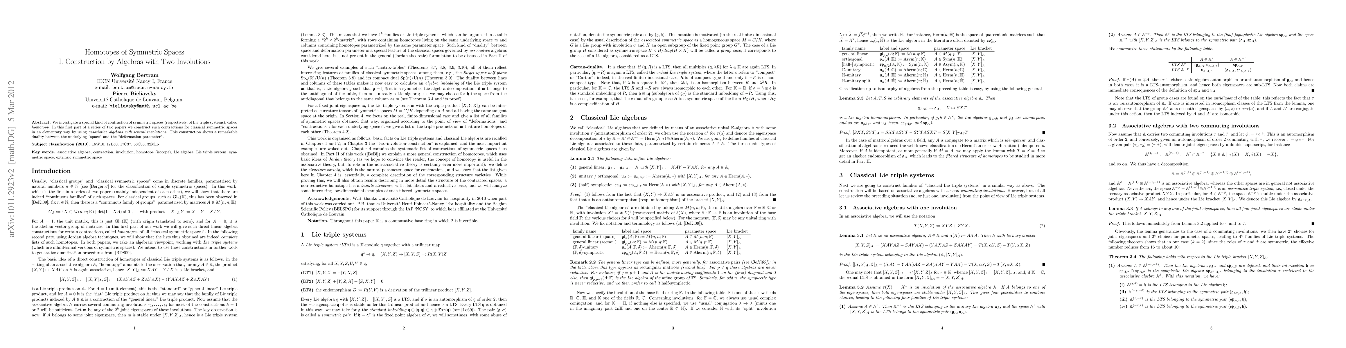 We investigate a special kind of contraction of symmetric spaces (respectively, of Lie triple systems), called homotopy. In this first part of a series of two papers we construct such contractions for classical symmetric spaces in an elementary way by using associative algebras with several involutions. This construction shows a remarkable duality between the underlying "space" and the "deformation parameter".