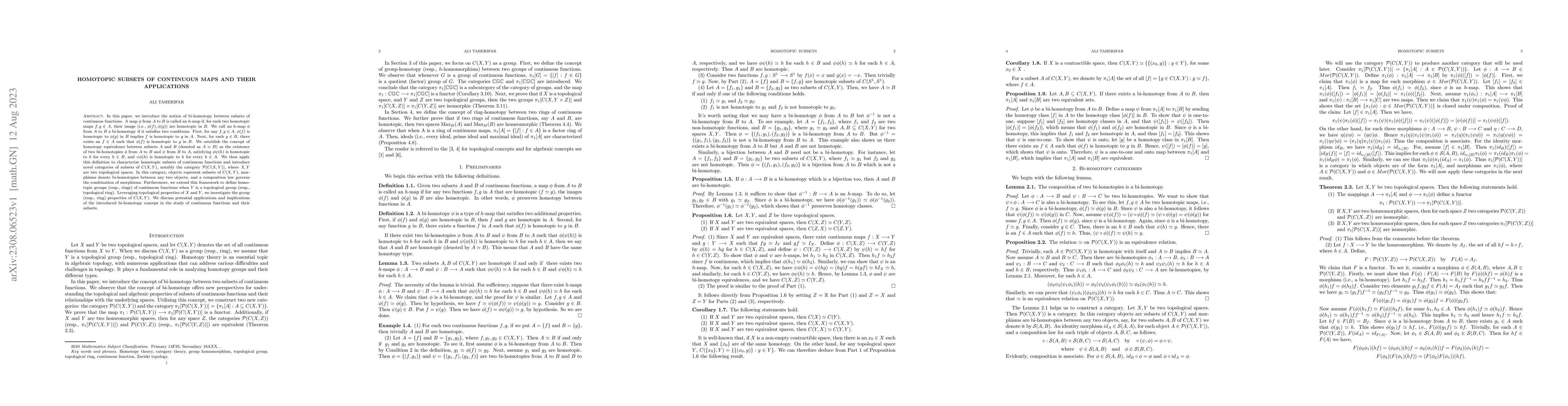 In this paper, we introduce the notion of bi-homotopy between subsets of continuous functions. A map $\phi$ from $A$ to $B$ is called an $h$-map if, for each two homotopic maps $f, g\in A$, their image (i.e., $\phi(f), \phi(g)$) are homotopic in $B$. We call an $h$-map $\phi$ from $A$ to $B$ a bi-homotopy if it satisfies two conditions. First, for any $f, g \in A$, $\phi(f)$ is homotopic to $\phi(g)$ in $B$ implies $f$ is homotopic to $g$ in $A$. Next, for each $g \in B$, there exists an $f \in A$ such that $\phi(f)$ is homotopic to $g$ in $B$. We establish the concept of homotopy equivalence between subsets $A$ and $B$ (denoted as $A \simeq B$) as the existence of two bi-homotopies $\phi$ from $A$ to $B$ and $\psi$ from $B$ to $A$, satisfying $\phi\psi(h)$ is homotopic to $h$ for every $h \in B$, and $\psi\phi(h)$ is homotopic to $h$ for every $h \in A$. We then apply this definition to characterize homotopic subsets of continuous functions and introduce novel categories of subsets of $C(X, Y)$, notably the category $\mathcal{P}(C(X, Y))$, where $X, Y$ are two topological spaces. In this category, objects represent subsets of $C(X, Y)$, morphisms denote bi-homotopies between any two objects, and a composition law governs the combination of morphisms. Furthermore, we extend this framework to define homotopic groups (resp., rings) of continuous functions when $Y$ is a topological group (resp., topological ring). Leveraging topological properties of $X$ and $Y$, we investigate the group (resp., ring) properties of $C(X, Y)$. We discuss potential applications and implications of the introduced bi-homotopy concept in the study of continuous functions and their subsets.
