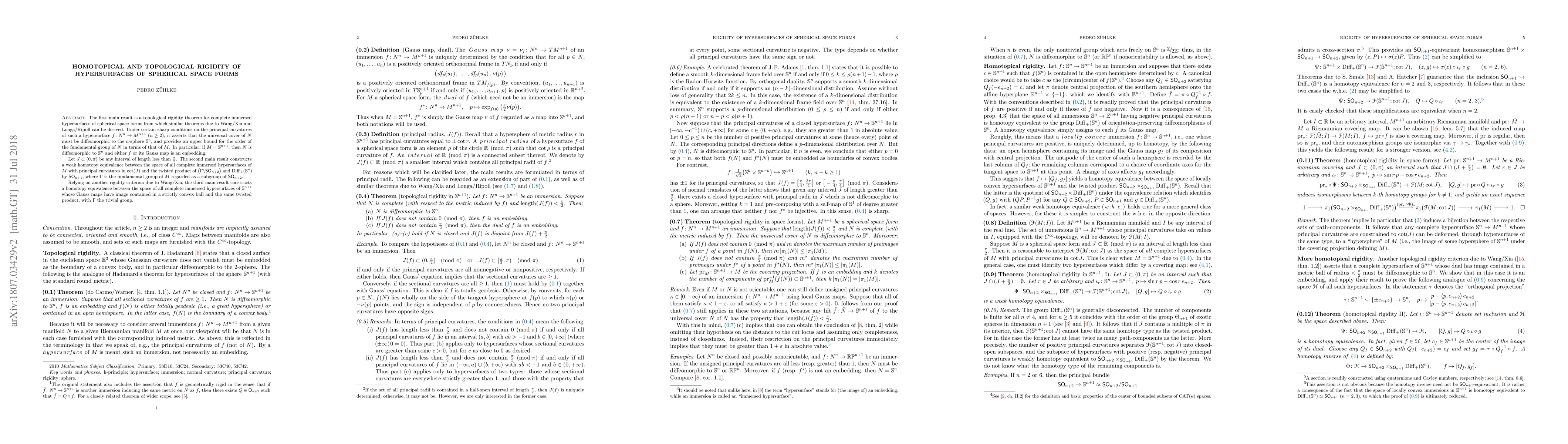The first main result is a topological rigidity theorem for complete immersed hypersurfaces of spherical space forms which extends similar results due to do Carmo/Warner, Wang/Xia and Longa/Ripoll. Under certain sharp conditions on the principal curvatures of such a hypersurface $ f \colon N^n \to M^{n+1} $ $( n\ge 2 )$, it asserts that the universal cover of $ N $ must be diffeomorphic to the $ n $-sphere $ {S}^n $, and provides an upper bound for the order of the fundamental group of $ N $ in terms of that of $ M $. In particular, if $ M = {S}^{n+1} $, then $ N $ is diffeomorphic to $ {S}^n $ and either $ f $ or its Gauss map is an embedding. Let $ J \subset (0,\pi) $ be any interval of length less than $ \frac{\pi}{2} $. The second main result constructs a weak homotopy equivalence between the space of all complete immersed hypersurfaces of $ M $ with principal curvatures in $ \cot (J) $ and the twisted product of $ \big( \Gamma\backslash \mathrm{SO}_{n+2} \big) $ and $ \mathrm{Diff}_+({S}^n) $ by $ \mathrm{SO}_{n+1} $, where $ \Gamma $ is the fundamental group of $ M $ regarded as a subgroup of $ \mathrm{SO}_{n+2} $. Relying on another rigidity criterion due to Wang/Xia, the third main result constructs a homotopy equivalence between the space of all complete immersed hypersurfaces of $ S^{n+1} $ whose Gauss maps have image contained in a strictly convex ball and the same twisted product, with $ \Gamma $ the trivial group.