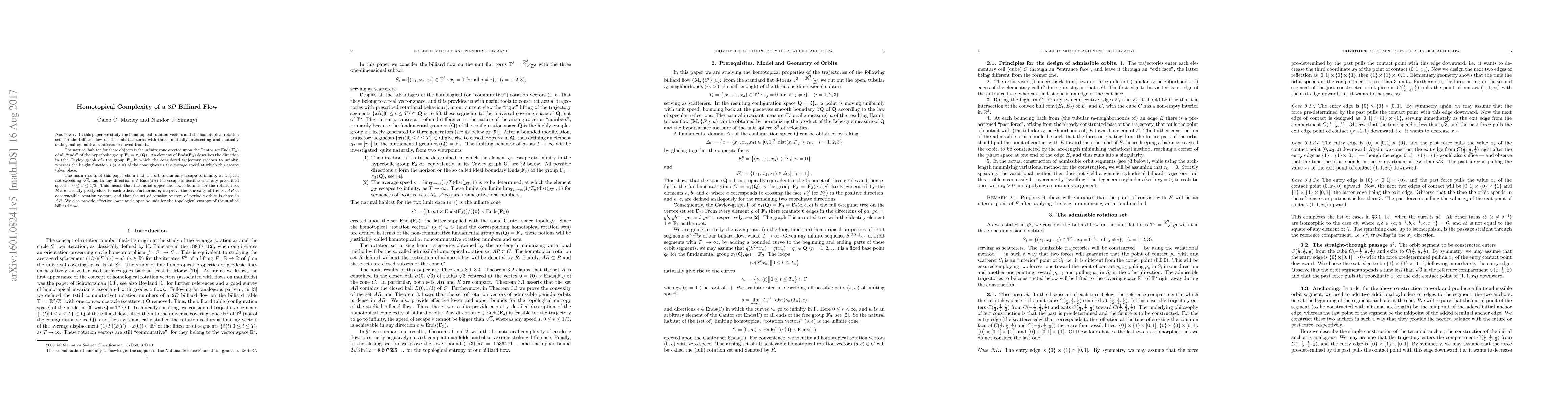 In this paper we study the homotopical rotation vectors and the homotopical rotation sets for the billiard flow on the unit flat torus with three, mutually intersecting and mutually orthogonal cylindrical scatterers removed from it. The natural habitat for these objects is the infinite cone erected upon the Cantor set $\text{Ends}(\textbf{F}_3)$ of all "ends" of the hyperbolic group $\textbf{F}_3=\pi_1(\mathbf{Q})$. An element of $\text{Ends}(\textbf{F}_3)$ describes the direction in (the Cayley graph of) the group $\textbf{F}_3$ in which the considered trajectory escapes to infinity, whereas the height function $s$ ($s\ge 0$) of the cone gives us the average speed at which this escape takes place. The main results of this paper claim that the orbits can only escape to infinity at a speed not exceeding $\sqrt{3}$, and in any direction $e\in\text{Ends}(\mathbf{F}_3)$ the escape is feasible with any prescribed speed $s$, $0\leq s\leq 1/3$. This means that the radial upper and lower bounds for the rotation set $R$ are actually pretty close to each other. Furthermore, we prove the convexity of the set $AR$ of constructible rotation vectors, and that the set of rotation vectors of periodic orbits is dense in $AR$. We also provide effective lower and upper bounds for the topological entropy of the studied billiard flow.