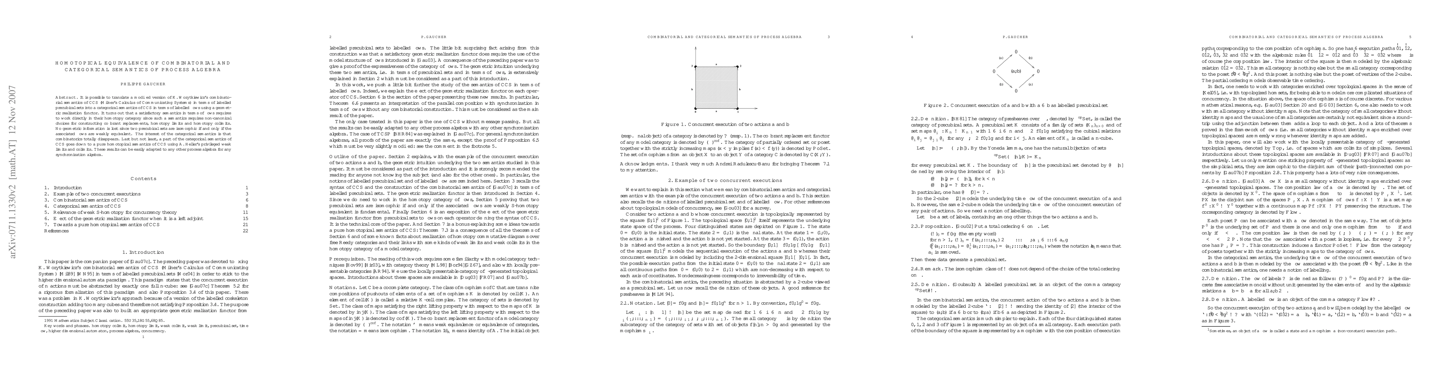 It is possible to translate a modified version of K. Worytkiewicz's combinatorial semantics of CCS (Milner's Calculus of Communicating Systems) in terms of labelled precubical sets into a categorical semantics of CCS in terms of labelled flows using a geometric realization functor. It turns out that a satisfactory semantics in terms of flows requires to work directly in their homotopy category since such a semantics requires non-canonical choices for constructing cofibrant replacements, homotopy limits and homotopy colimits. No geometric information is lost since two precubical sets are isomorphic if and only if the associated flows are weakly equivalent. The interest of the categorical semantics is that combinatorics totally disappears. Last but not least, a part of the categorical semantics of CCS goes down to a pure homotopical semantics of CCS using A. Heller's privileged weak limits and colimits. These results can be easily adapted to any other process algebra for any synchronization algebra.