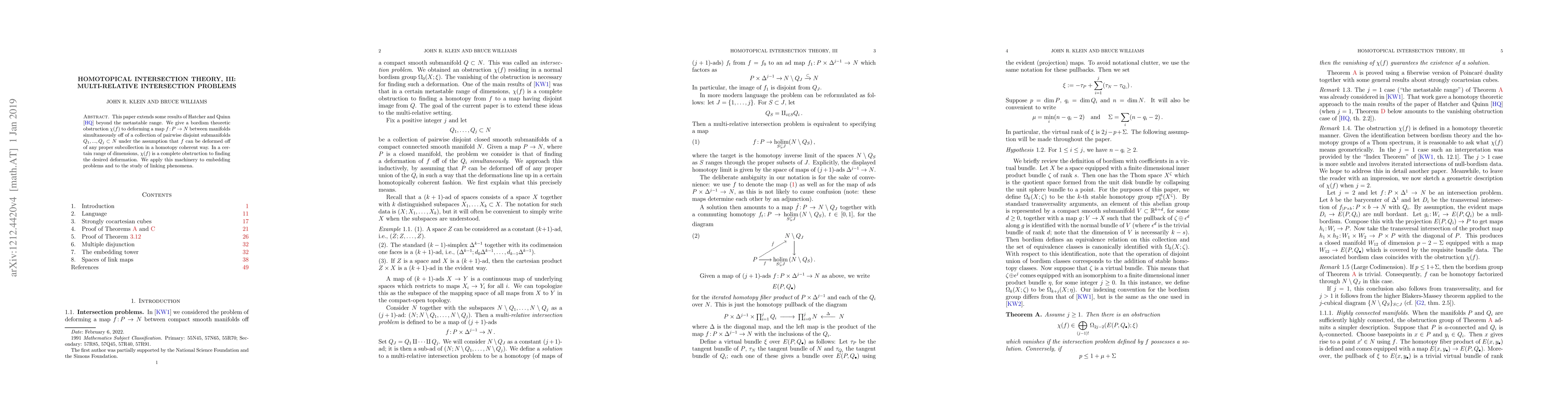 Researchers extend previous results on homotopical intersection theory to study how maps between manifolds can be deformed simultaneously off of disjoint submanifolds, finding a bordism theoretic obstruction in certain dimensions that prevents deformation.