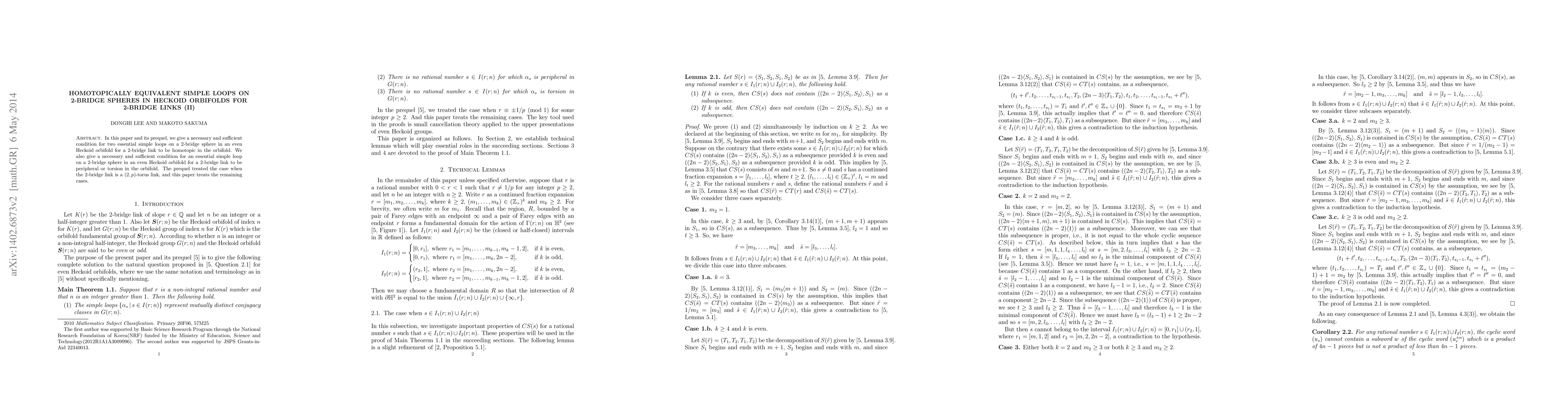 In this paper and its prequel, we give a necessary and sufficient condition for two essential simple loops on a 2-bridge sphere in an even Heckoid orbifold for a 2-bridge link to be homotopic in the orbifold. We also give a necessary and sufficient condition for an essential simple loop on a 2-bridge sphere in an even Heckoid orbifold for a 2-bridge link to be peripheral or torsion in the orbifold. The prequel treated the case when the 2-bridge link is a $(2,p)$-torus link, and this paper treats the remaining cases.