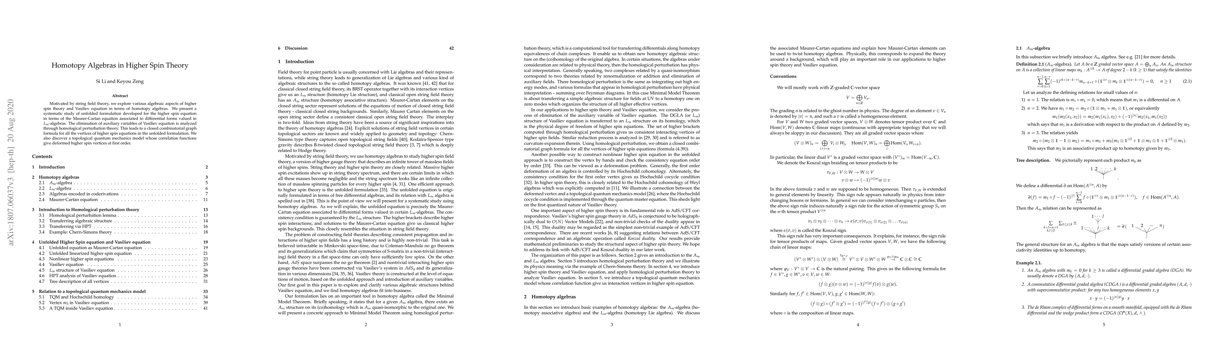 This paper investigates the algebraic structure of higher spin theory using homotopy algebras, focusing on the unfolded formulation of the Vasiliev equation via Maurer-Cartan equations. It employs homological perturbation theory to eliminate auxiliary variables and derives a combinatorial graph formula for higher spin vertices, alongside a topological quantum mechanics model correlating to deformed higher spin vertices.