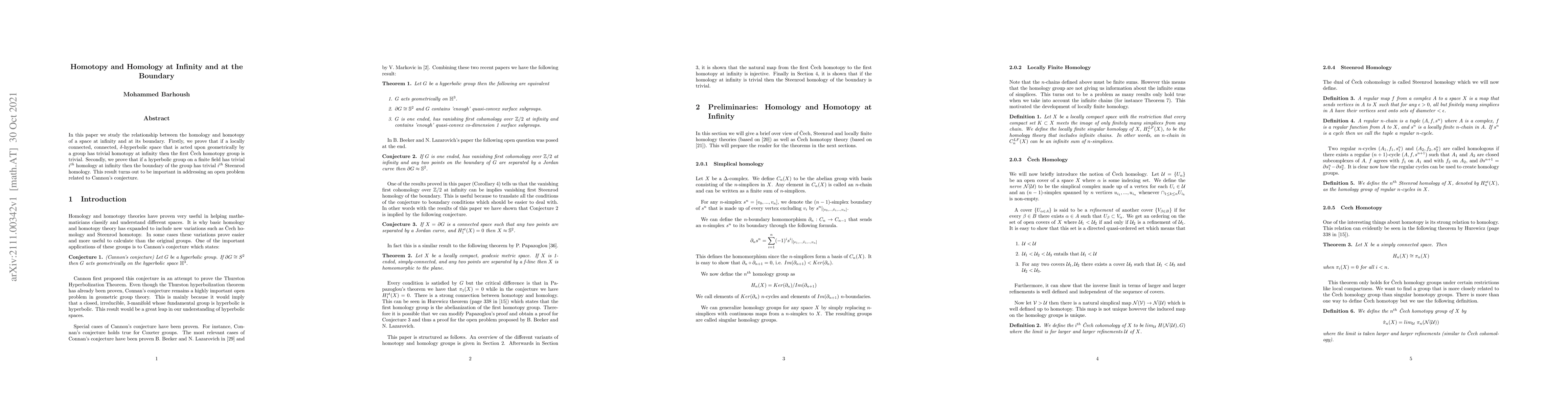 In this paper we study the relationship between the homology and homotopy of a space at infinity and at its boundary. Firstly, we prove that if a locally connected, connected, $\delta$-hyperbolic space that is acted upon geometrically by a group has trivial homotopy at infinity then the first \v{C}ech homotopy group is trivial. Secondly, we prove that if a hyperbolic group on a finite field has trivial $i^{th}$ homology at infinity then the boundary of the group has trivial $i^{th}$ Steenrod homology. This result turns out to be important in addressing an open problem related to Cannon's conjecture.
