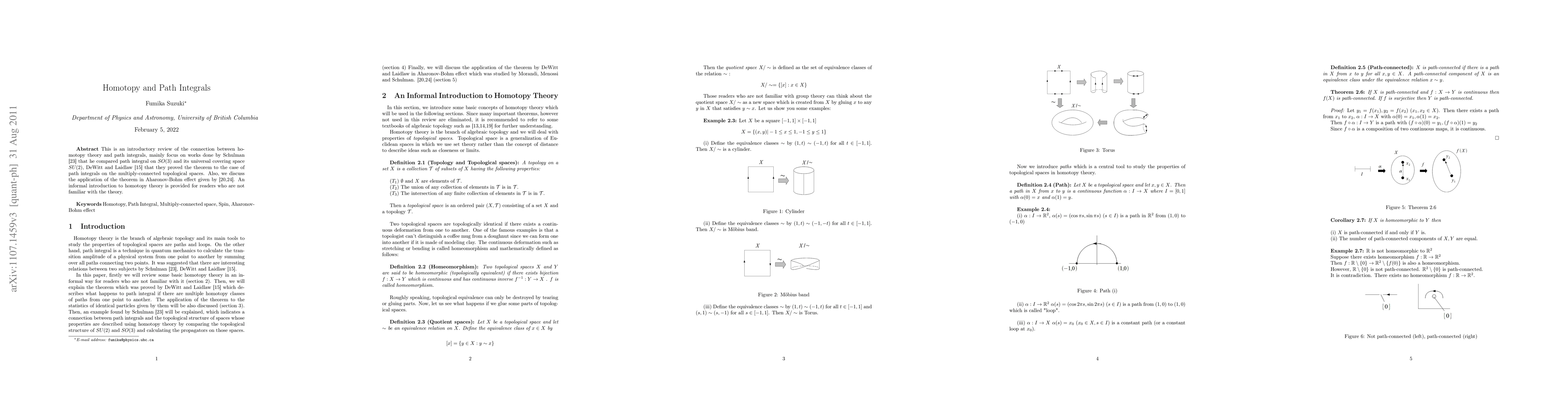 This paper reviews the relationship between homotopy theory and path integrals, focusing on Schulman's work comparing path integrals on SO(3) and SU(2), and DeWitt and Laidlaw's theorem for multiply-connected spaces. It also discusses applications in the Aharonov-Bohm effect and provides an informal introduction to homotopy theory for unfamiliar readers.