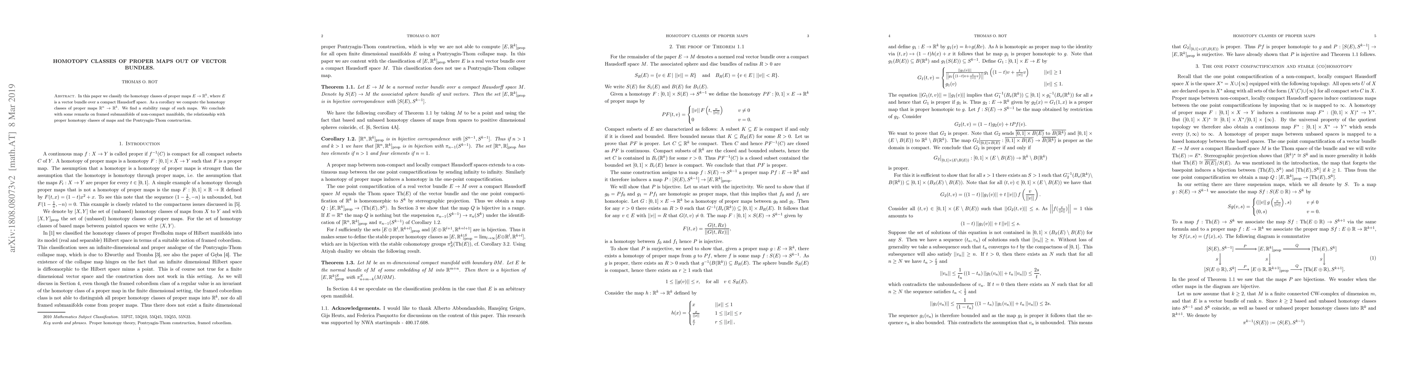 This paper classifies the homotopy classes of proper maps from a vector bundle $E$ over a compact Hausdorff space to $\mathbb R^k$, establishing a stability range. It also extends the findings to proper maps from $\mathbb R^n$ to $\mathbb R^k$ and discusses connections to framed submanifolds and the Pontryagin-Thom construction.