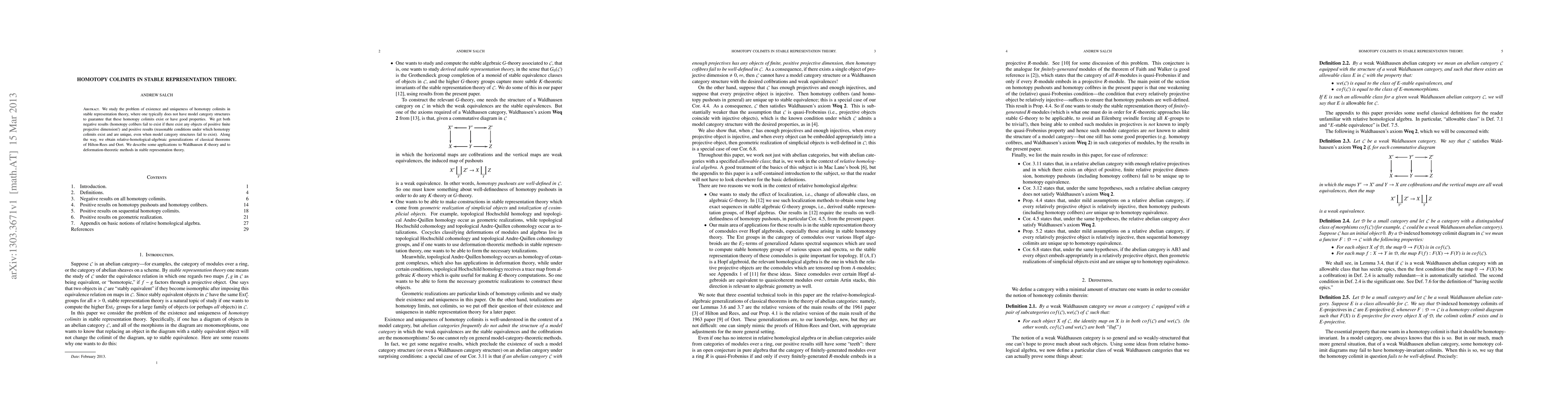 This paper explores the existence and uniqueness of homotopy colimits in stable representation theory, revealing both the limitations (e.g., non-existence of homotopy cofibers in certain dimensions) and conditions for their existence and uniqueness. It also generalizes classical theorems and applies findings to Waldhausen $K$-theory and deformation-theoretic methods.