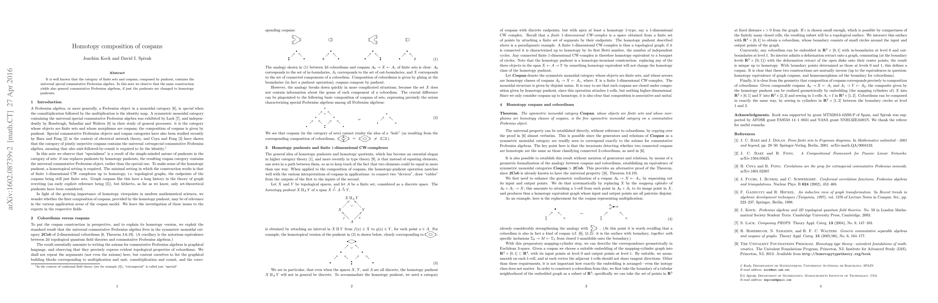 It is well known that the category of finite sets and cospans, composed by pushout, contains the universal {\em special} commutative Frobenius algebra. In this note we observe that the same construction yields also general commutative Frobenius algebras, if just the pushouts are changed to homotopy pushouts.