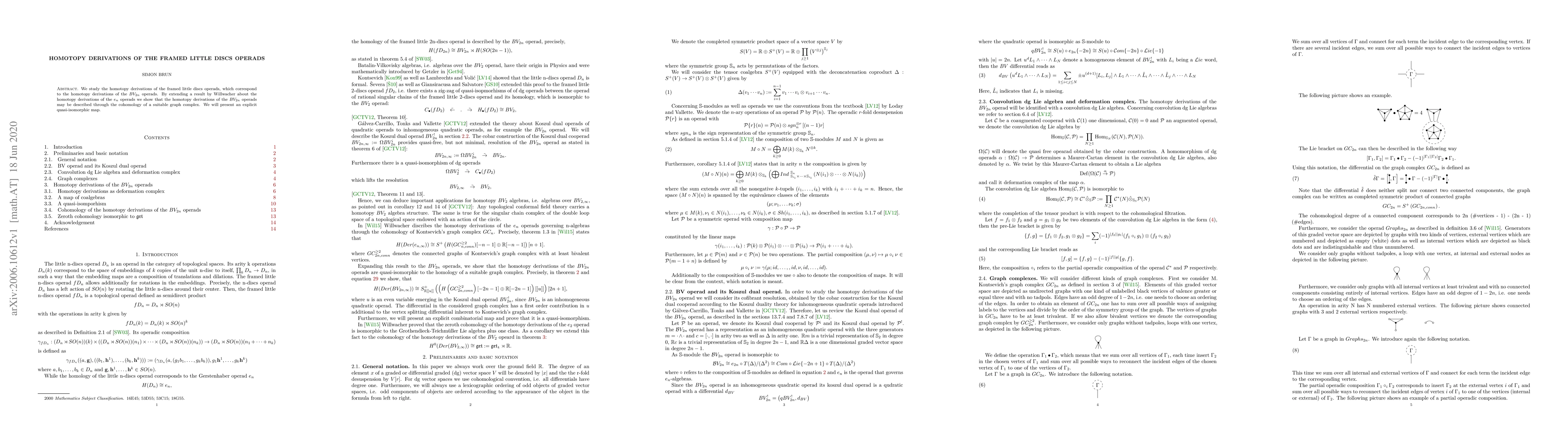 We study the homotopy derivations of the framed little discs operads, which correspond to the homotopy derivations of the BV2n operads. By extending a result by Willwacher about the homotopy derivations of the en operads we show that the homotopy derivations of the BV2n operads may be described through the cohomology of a suitable graph complex. We will present an explicit quasi-isomorphic map.