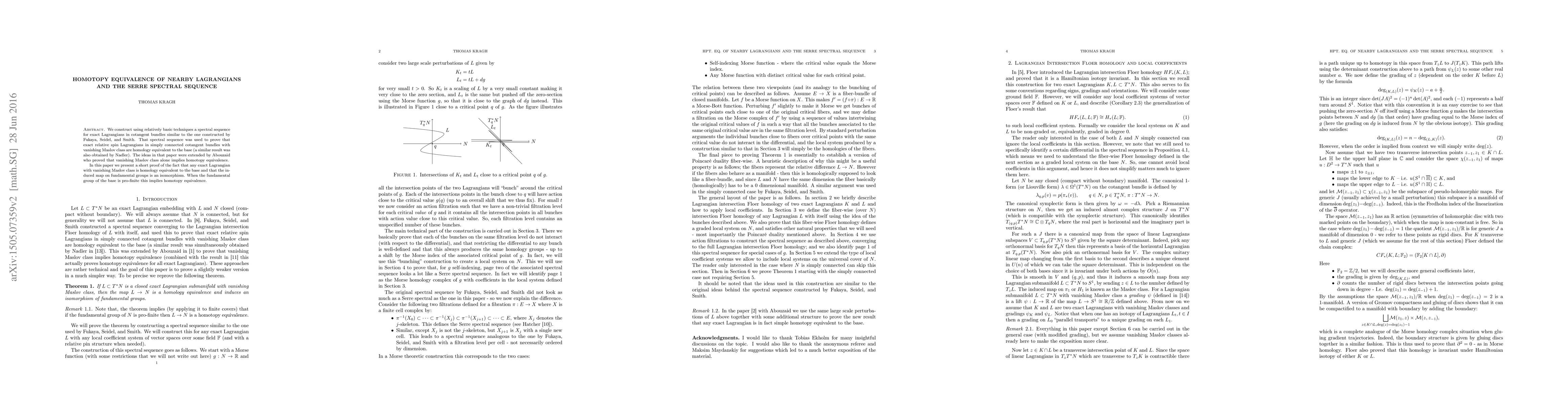 This paper presents a simplified proof for the homotopy equivalence of exact Lagrangians with vanishing Maslov class, extending earlier work that demonstrated homology equivalence. It utilizes a spectral sequence similar to that of Fukaya, Seidel, and Smith.