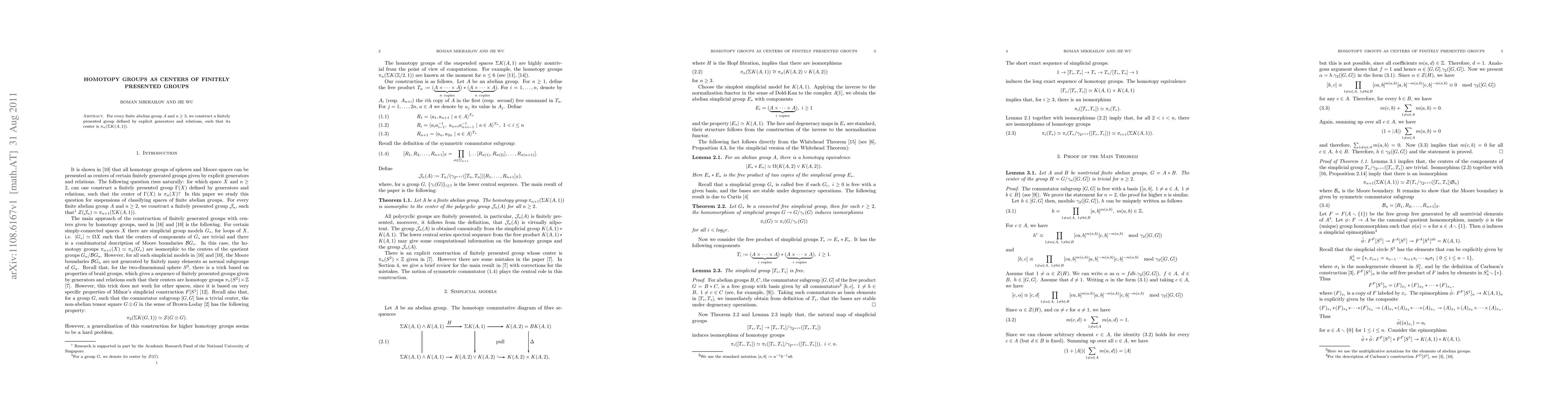 For every finite abelian group $A$ and $n\geq 3$, we construct a finitely presented group defined by explicit generators and relations, such that its center is $\pi_n(\Sigma K(A,1))$.