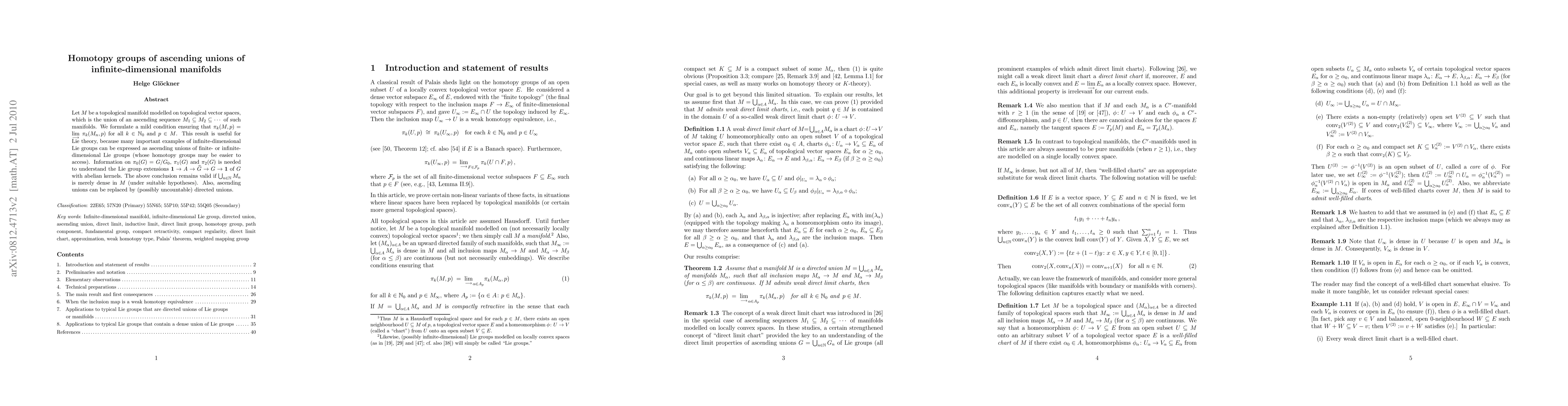 This paper establishes conditions under which the k-th homotopy group of an ascending union of infinite-dimensional manifolds equals the direct limit of the k-th homotopy groups of the constituent manifolds. This result aids in Lie theory by simplifying the analysis of homotopy groups for complex infinite-dimensional Lie groups.