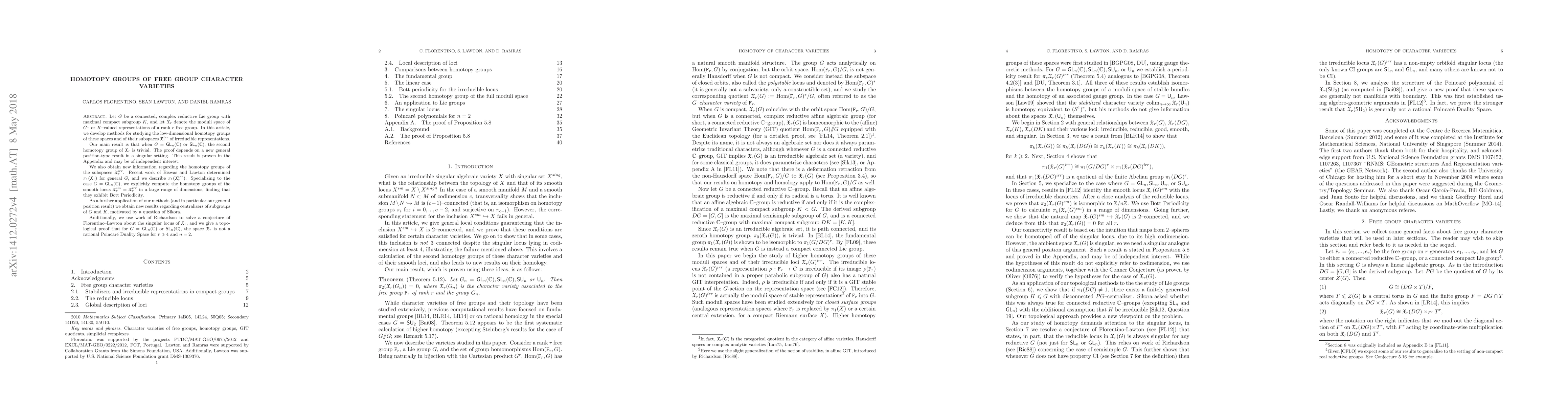 This paper develops methods to study the low-dimensional homotopy groups of character varieties of free groups associated with complex reductive Lie groups, proving that the second homotopy group of these spaces is trivial when the group is GL(n,C) or SL(n,C). It also computes the homotopy groups of irreducible subspaces and finds Bott Periodicity in certain dimensions.