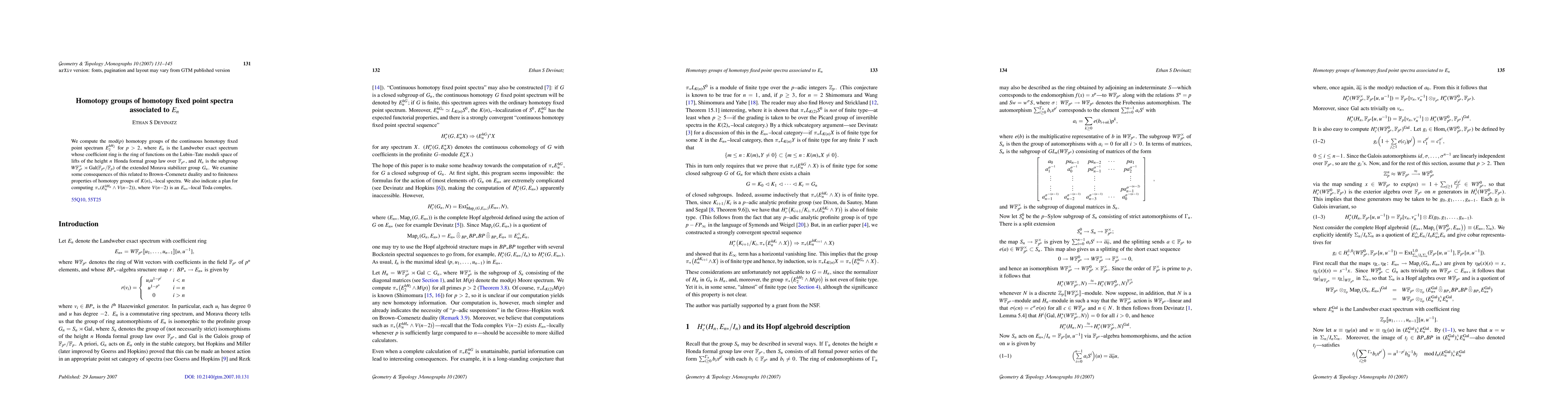 We compute the mod(p) homotopy groups of the continuous homotopy fixed point spectrum E_2^{hH_2} for p>2, where E_n is the Landweber exact spectrum whose coefficient ring is the ring of functions on the Lubin-Tate moduli space of lifts of the height n Honda formal group law over F_{p^n}, and H_n is the subgroup WF^x_{p^n} wreath product Gal(F_{p^n}/F_p) of the extended Morava stabilizer group G_n. We examine some consequences of this related to Brown-Comenetz duality and to finiteness properties of homotopy groups of K(n)_*-local spectra. We also indicate a plan for computing pi_*(E_n^{hH_n} smash V(n-2)), where V(n-2) is an E_{n*}-local Toda complex.
