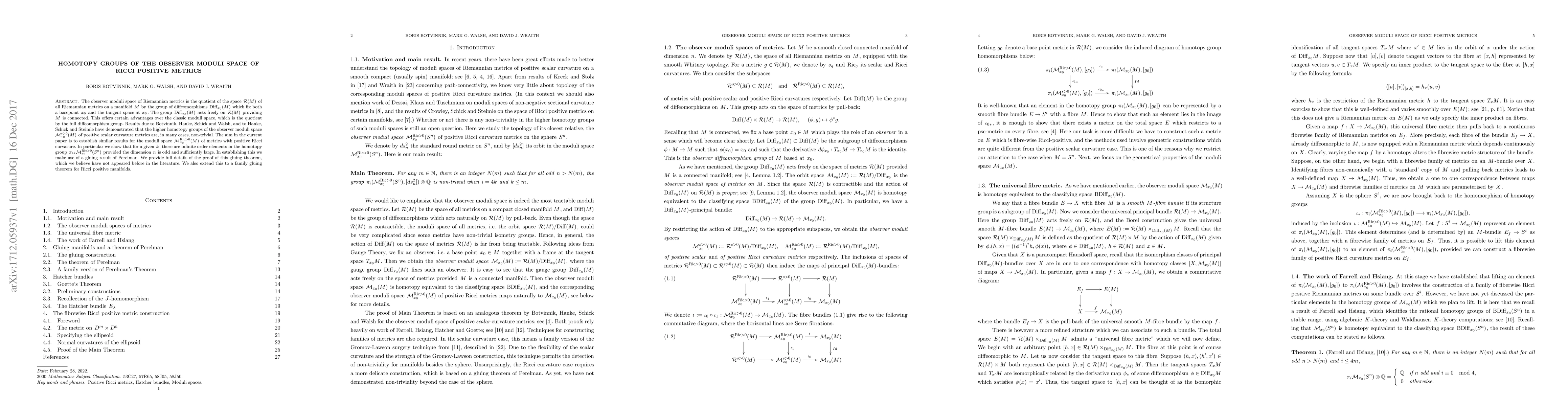 The observer moduli space of Riemannian metrics is the quotient of the space $\mathcal{R}(M)$ of all Riemannian metrics on a manifold $M$ by the group of diffeomorphisms $\mathrm{Diff}_{x_0}(M)$ which fix both a basepoint $x_0$ and the tangent space at $x_0$. The group $\mathrm{Diff}_{x_0}(M)$ acts freely on $\mathcal{R}(M)$ providing $M$ is connected. This offers certain advantages over the classic moduli space, which is the quotient by the full diffeomorphism group. Results due to Botvinnik, Hanke, Schick and Walsh, and to Hanke, Schick and Steimle have demonstrated that the higher homotopy groups of the observer moduli space $\mathcal{M}_{x_0}^{s>0}(M)$ of positive scalar curvature metrics are, in many cases, non-trivial. The aim in the current paper is to establish similar results for the moduli space $\mathcal{M}_{x_0}^{\mathrm{Ric}>0}(M)$ of metrics with positive Ricci curvature. In particular we show that for a given $k$, there are infinite order elements in the homotopy group $\pi_{4k}\mathcal{M}_{x_0}^{\mathrm{Ric}>0}(S^n)$ provided the dimension $n$ is odd and sufficiently large. In establishing this we make use of a gluing result of Perelman. We provide full details of the proof of this gluing theorem, which we believe have not appeared before in the literature. We also extend this to a family gluing theorem for Ricci positive manifolds.