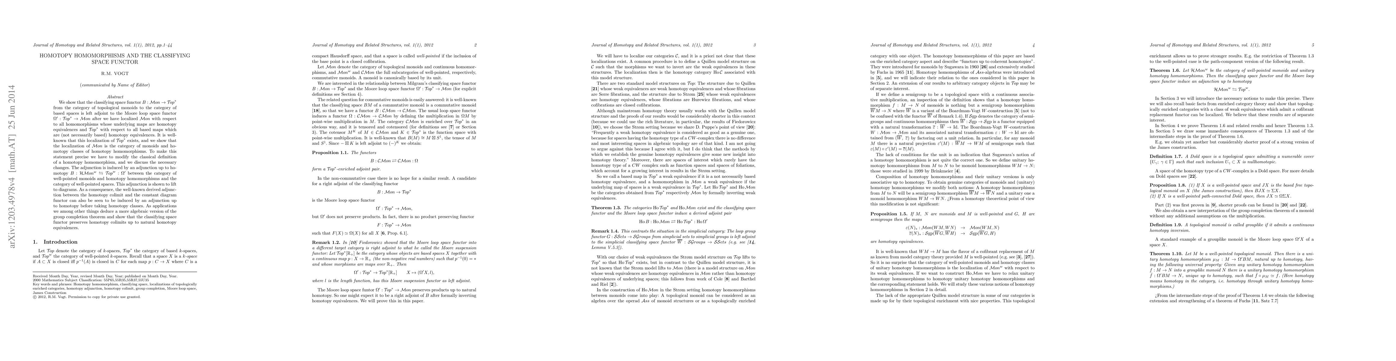 We show that the classifying space functor $B: Mon \to Top*$ from the category of topological monoids to the category of based spaces is left adjoint to the Moore loop space functor $\Omega': Top*\to Mon$ after we have localized $Mon$ with respect to all homomorphisms whose underlying maps are homotopy equivalences and $Top*$ with respect to all based maps which are (not necessarily based) homotopy equivalences. It is well-known that this localization of $Top*$ exists, and we show that the localization of $Mon$ is the category of monoids and homotopy classes of homotopy homomorphisms. To make this statement precise we have to modify the classical definition of a homotopy homomorphism, and we discuss the necessary changes. The adjunction is induced by an adjunction up to homotopy between the category of well-pointed monoids and homotopy homomorphisms and the category of well-pointed spaces. This adjunction is shown to lift to diagrams. As a consequence, the well-known derived adjunction between the homotopy colimit and the constant diagram functor can also be seen to be induced by an adjuction up to homotopy before taking homotopy classes. As applications we among other things deduce a more algebraic version of the group completion theorem and show that the classifying space functor preserves homotopy colimits up to natural homotopy equivalences.