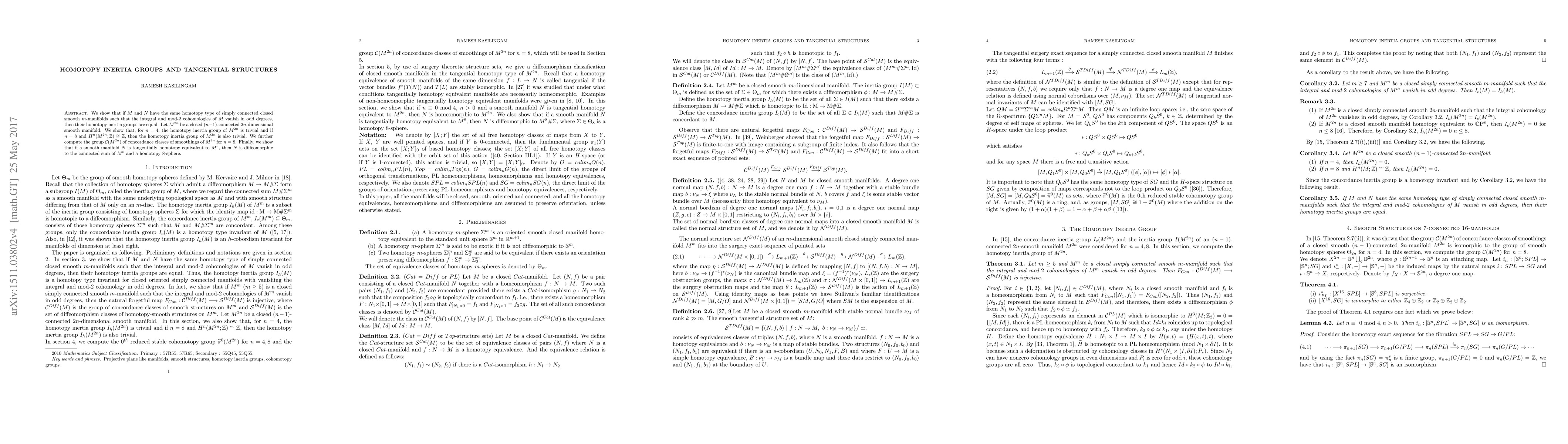 This paper demonstrates that homotopy inertia groups are equal for certain simply connected closed smooth manifolds with specific cohomological properties, proving the homotopy inertia group is trivial for $n=4$ and $n=8$ under certain conditions. It also explores tangential homotopy equivalences and concludes that tangentially homotopy equivalent manifolds to $M^8$ are diffeomorphic to the connected sum of $M^8$ and a homotopy $8$-sphere.