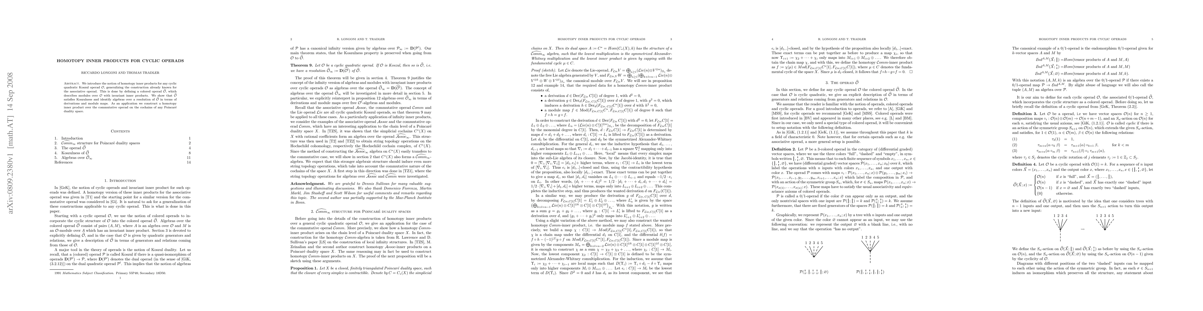 The paper introduces homotopy inner products for cyclic quadratic Koszul operads via a colored operad $\widehat{\mathcal O}$ that generalizes the associative case. It demonstrates the Koszulness of $\widehat{\mathcal O}$ and connects algebras over its resolution to derivations and module maps, culminating in a homotopy inner product for the commutative operad on Poincar\'e duality spaces.
