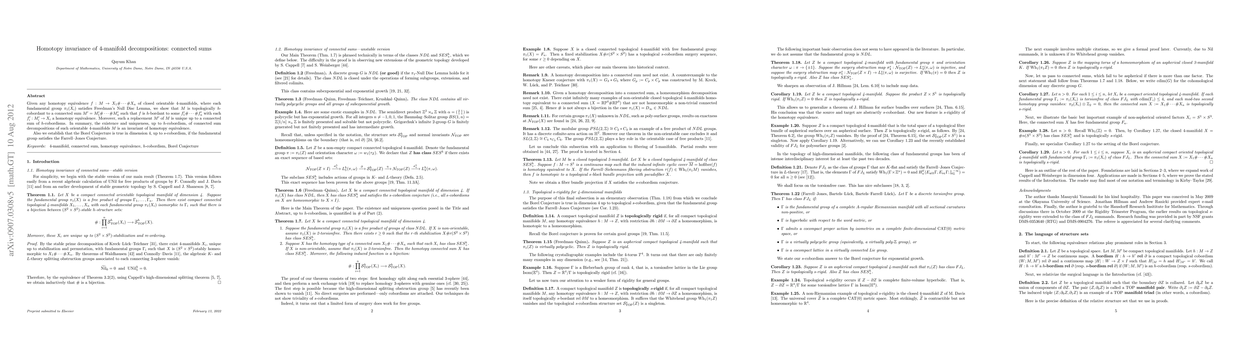We show, up to h-cobordism, that the existence and uniqueness of connected sum decompositions of oriented 4-dimensional manifolds is an invariant of homotopy equivalence, assuming that the fundamental group of each summand is "good" in the sense of Freedman and Quinn. On a separate note, we observe that the Borel Conjecture is true in dimension 4 up to s-cobordism, assuming that the fundamental group satisfies the Farrell--Jones Conjecture.