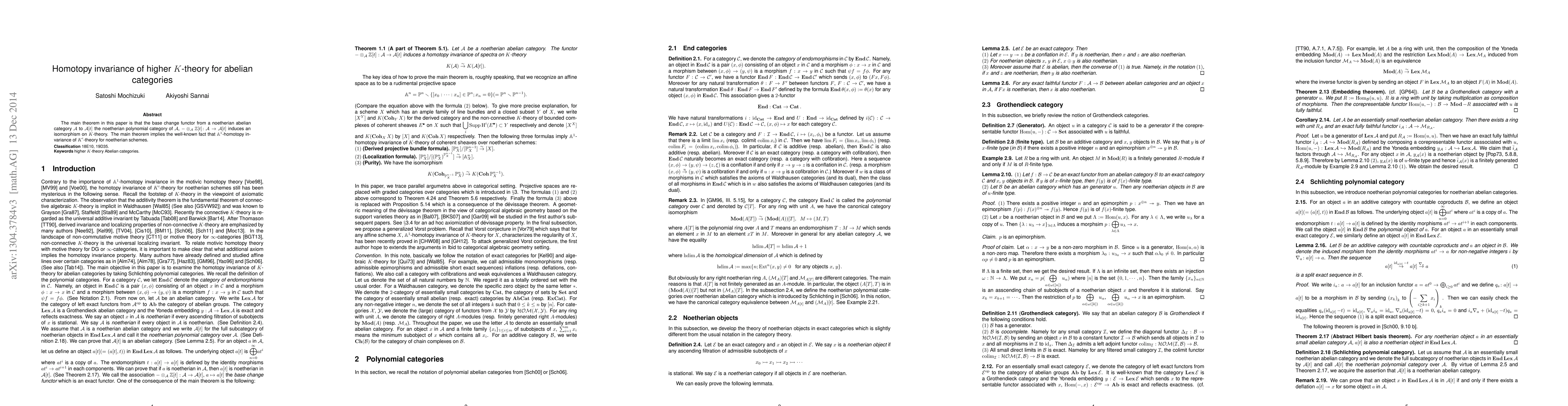 The main theorem in this paper is that the base change functor from a noetherian abelian category to its noetherian polynomial category induces an isomorphism on K-theory. The main theorem implies the well-known fact that A^1-homotopy invariance of K'-theory for noetherian schemes.
