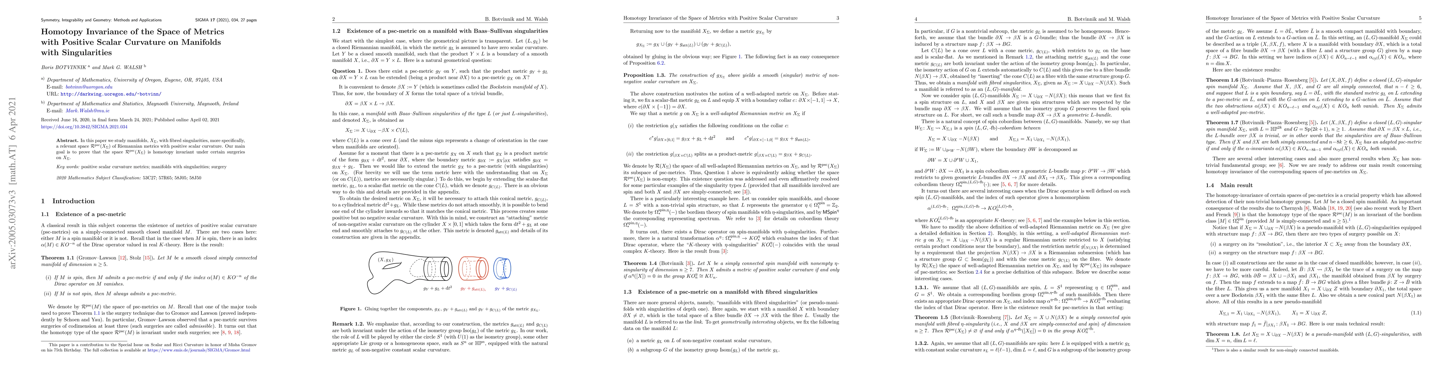 This paper investigates manifolds with fibred singularities, focusing on the space of Riemannian metrics with positive scalar curvature, ${\mathcal R}^{\rm psc}(X_{\Sigma})$, and proves its homotopy invariance under specific surgeries on $X_{\Sigma}$.