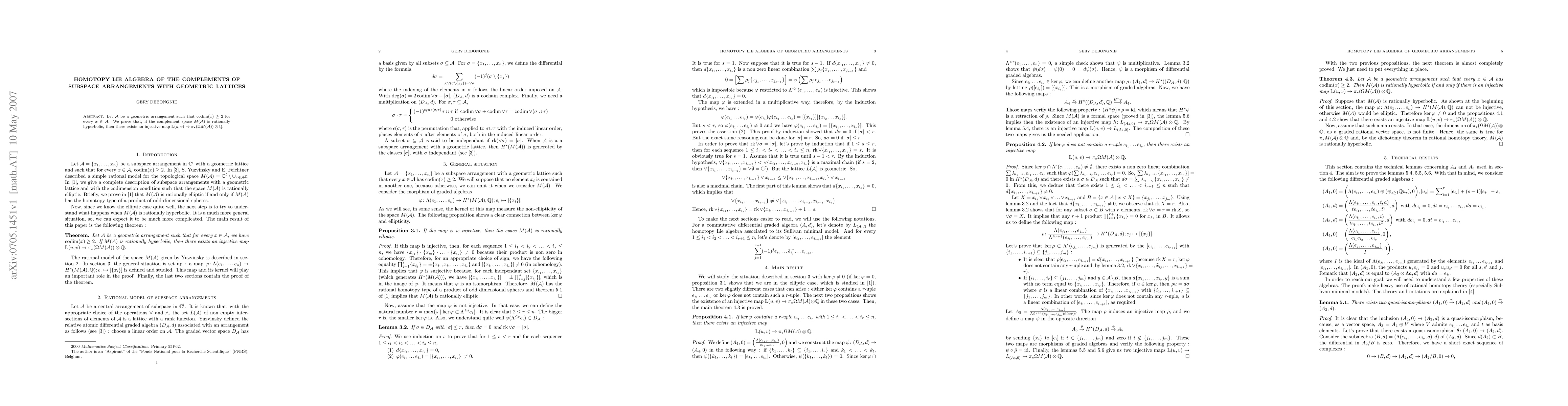 Summary: The paper proves that for geometric arrangements where all subspaces have codimension greater than one, if the complement space is rationally hyperbolic, there exists an injective map from a free Lie algebra to the homotopy Lie algebra of the complement. This establishes a connection between free Lie algebras and homotopy Lie algebras in rationally hyperbolic settings.