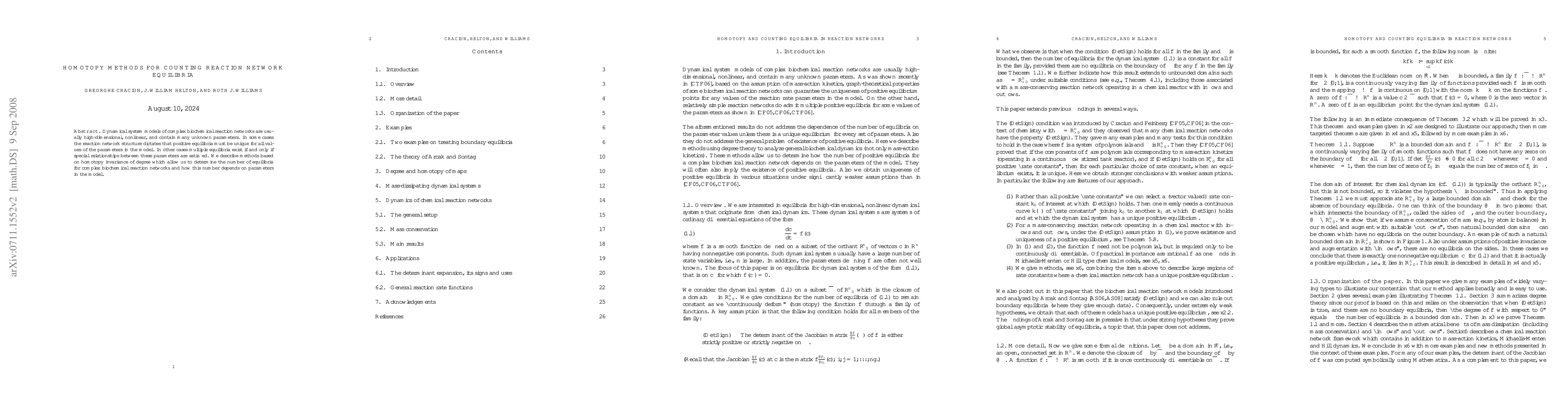 Dynamical system models of complex biochemical reaction networks are usually high-dimensional, nonlinear, and contain many unknown parameters. In some cases the reaction network structure dictates that positive equilibria must be unique for all values of the parameters in the model. In other cases multiple equilibria exist if and only if special relationships between these parameters are satisfied. We describe methods based on homotopy invariance of degree which allow us to determine the number of equilibria for complex biochemical reaction networks and how this number depends on parameters in the model.