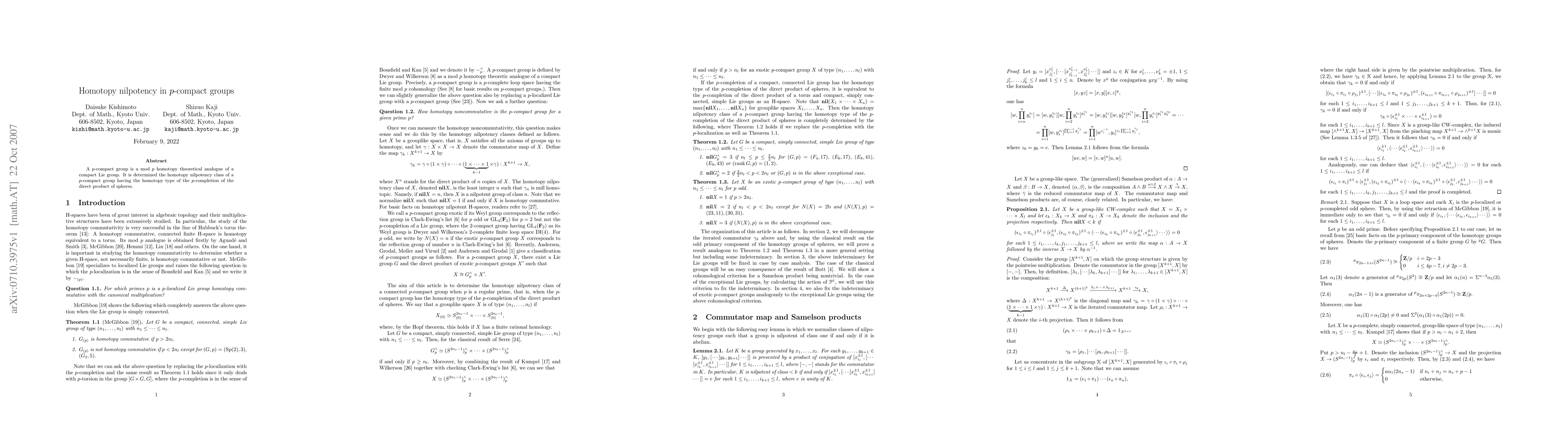 Two-line summary: This paper investigates the homotopy nilpotency class of p-compact groups, establishing that these groups, which are mod p analogues of compact Lie groups, exhibit a specific nilpotency class when their homotopy type matches that of the p-completion of the direct product of spheres. The study provides a deeper understanding of the homotopy theoretical properties of p-compact groups.