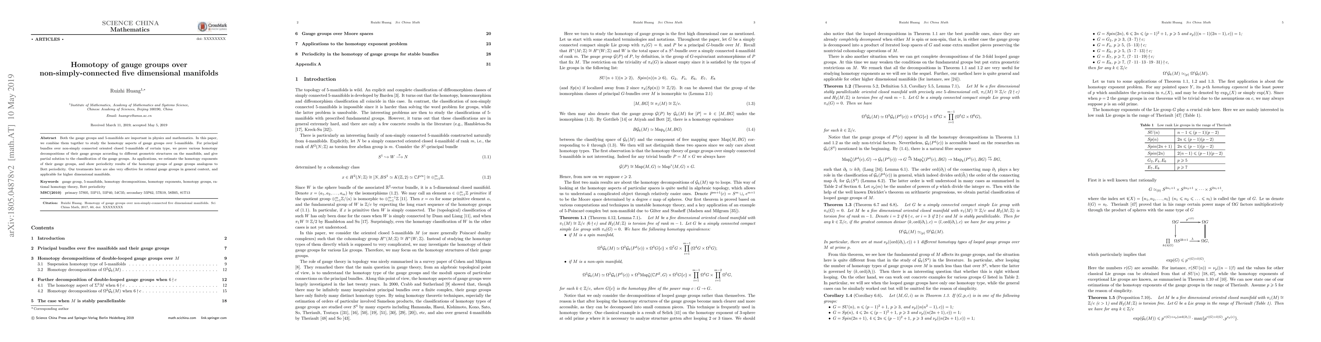 This paper investigates the homotopy properties of gauge groups over specific non-simply connected five-dimensional manifolds, proving various homotopy decompositions and offering a partial classification of these gauge groups. It also demonstrates periodicity in the homotopy groups analogous to Bott periodicity and applies these findings to rational gauge groups in broader contexts.