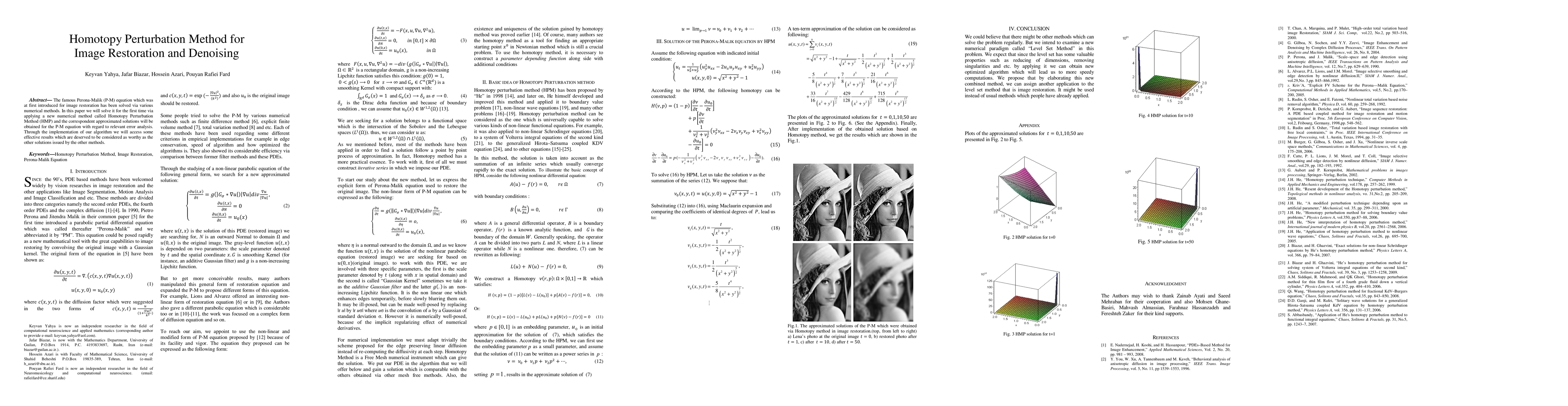 The famous Perona-Malik (P-M) equation which was at first introduced for image restoration has been solved via various numerical methods. In this paper we will solve it for the first time via applying a new numerical method called Homotopy Perturbation Method (HMP) and the correspondent approximated solutions will be obtained for the P-M equation with regards to relevant error analysis. Through implementation of our algorithm we will access some effective results which are deserved to be considered as worthy as the other solutions issued by the other methods.