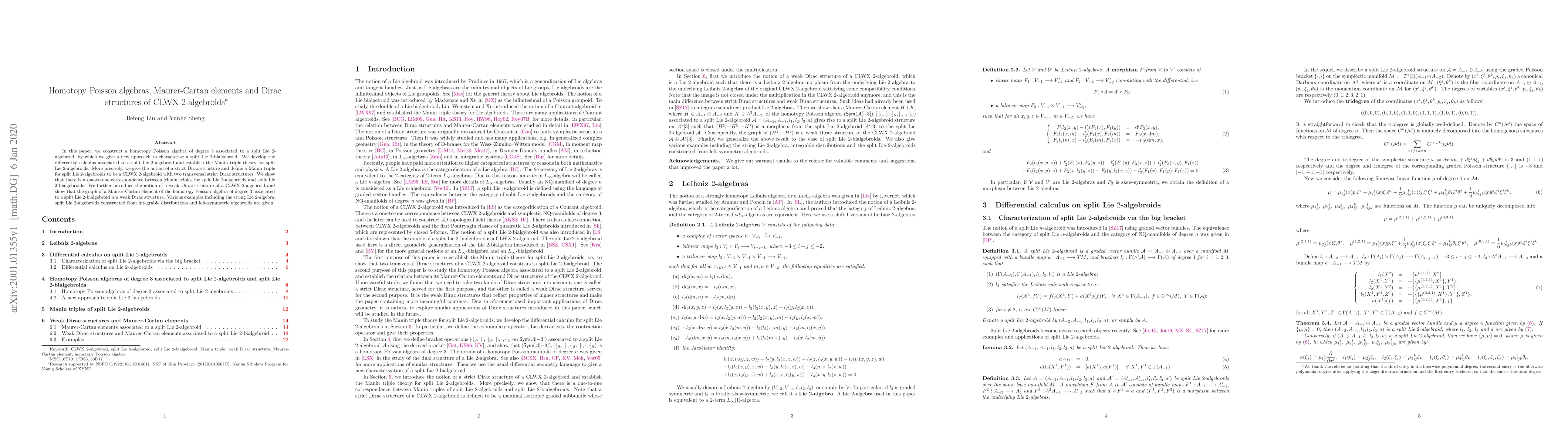 In this paper, we construct a homotopy Poisson algebra of degree 3 associated to a split Lie 2-algebroid, by which we give a new approach to characterize a split Lie 2-bialgebroid. We develop the differential calculus associated to a split Lie 2-algebroid and establish the Manin triple theory for split Lie 2-algebroids. More precisely, we give the notion of a strict Dirac structure and define a Manin triple for split Lie 2-algebroids to be a CLWX 2-algebroid with two transversal strict Dirac structures. We show that there is a one-to-one correspondence between Manin triples for split Lie 2-algebroids and split Lie 2-bialgebroids. We further introduce the notion of a weak Dirac structure of a CLWX 2-algebroid and show that the graph of a Maurer-Cartan element of the homotopy Poisson algebra of degree 3 associated to a split Lie 2-bialgebroid is a weak Dirac structure. Various examples including the string Lie 2-algebra, split Lie 2-algebroids constructed from integrable distributions and left-symmetric algebroids are given.