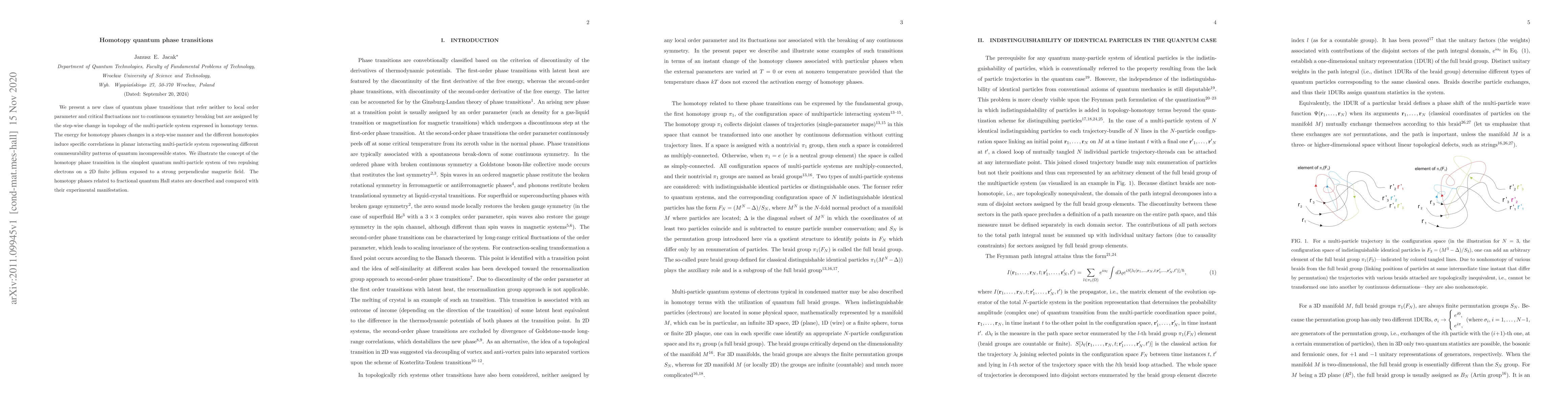We present a new class of quantum phase transitions that refer neither to local order parameter and critical fluctuations nor to continuous symmetry breaking but are assigned by the step-wise change in topology of the multi-particle system expressed in homotopy terms. The energy for homotopy phases changes in a step-wise manner and the different homotopies induce specific correlations in planar interacting multi-particle system representing different commesurability patterns of quantum incompressible states. We illustrate the concept of the homotopy phase transition in the simplest quantum multi-particle system of two repulsing electrons on a 2D finite jellium exposed to a strong perpendicular magnetic field. The homotopy phases related to fractional quantum Hall states are described and compared with their experimental manifestation.