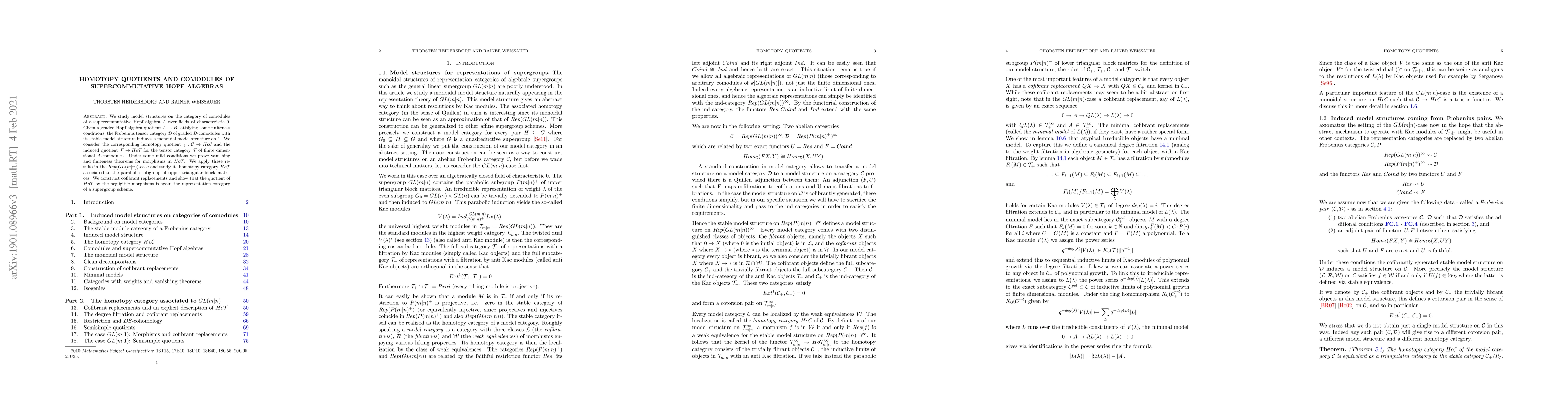 We study induced model structures on Frobenius categories. In particular we consider the case where $\mathcal{C}$ is the category of comodules of a supercommutative Hopf algebra $A$ over a field $k$. Given a graded Hopf algebra quotient $A \to B$ satisfying some finiteness conditions, the Frobenius tensor category $\mathcal{D}$ of graded $B$-comodules with its stable model structure induces a monoidal model structure on $\mathcal{C}$. We consider the corresponding homotopy quotient $\gamma: \mathcal{C} \to Ho \mathcal{C}$ and the induced quotient $\mathcal{T} \to Ho \mathcal{T}$ for the tensor category $\mathcal{T}$ of finite dimensional $A$-comodules. Under some mild conditions we prove vanishing and finiteness theorems for morphisms in $Ho \mathcal{T}$. We apply these results in the $Rep (GL(m|n))$-case and study its homotopy category $Ho \mathcal{T}$.