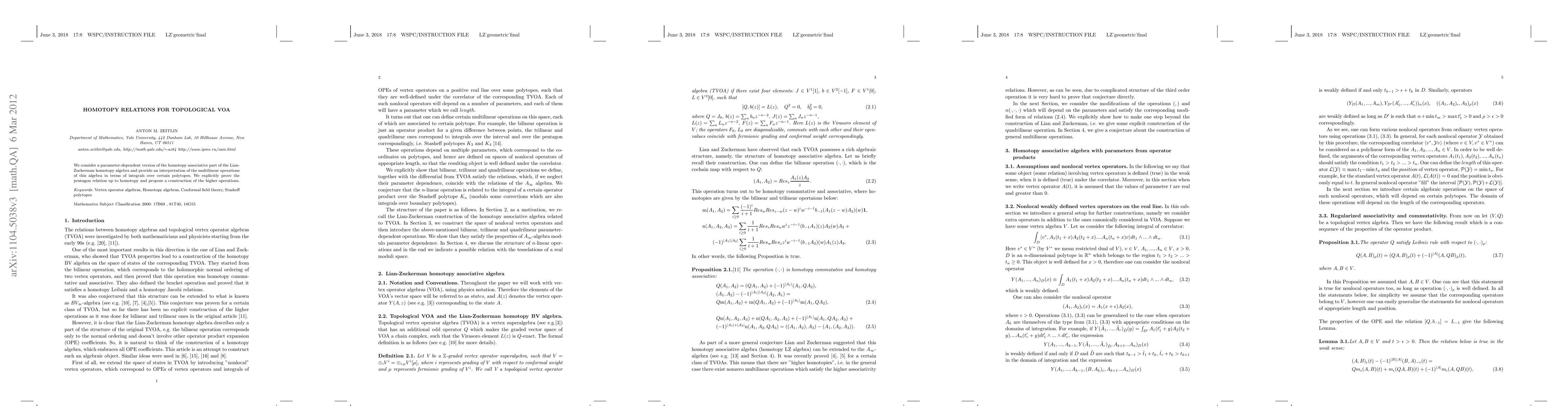 We consider a parameter-dependent version of the homotopy associative part of the Lian-Zuckerman homotopy algebra and provide the interpretation of multilinear operations of this algebra in terms of integrals over certain polytopes. We explicitly prove the pentagon relation up to homotopy and propose a construction of higher operations.