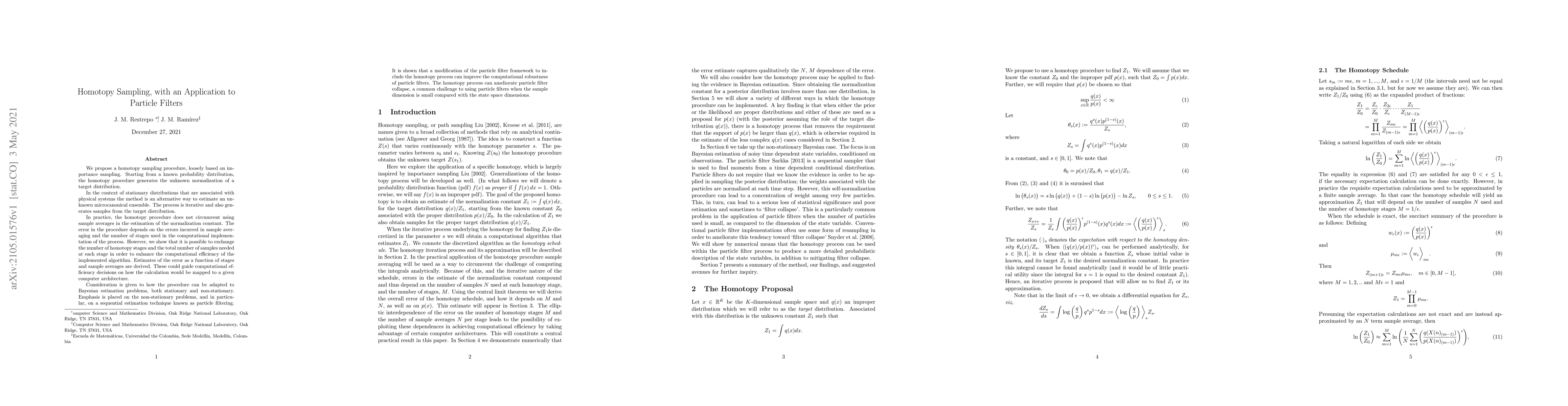 We propose a homotopy sampling procedure, loosely based on importance sampling. Starting from a known probability distribution, the homotopy procedure generates the unknown normalization of a target distribution. In the context of stationary distributions that are associated with physical systems the method is an alternative way to estimate an unknown microcanonical ensemble. The process is iterative and also generates samples from the target distribution. In practice, the homotopy procedure does not circumvent using sample averages in the estimation of the normalization constant. The error in the procedure depends on the errors incurred in sample averaging and the number of stages used in the computational implementation of the process. However, we show that it is possible to exchange the number of homotopy stages and the total number of samples needed at each stage in order to enhance the computational efficiency of the implemented algorithm. Estimates of the error as a function of stages and sample averages are derived. These could guide computational efficiency decisions on how the calculation would be mapped to a given computer architecture. Consideration is given to how the procedure can be adapted to Bayesian estimation problems, both stationary and non-stationary. Emphasis is placed on the non-stationary problems, and in particular, on a sequential estimation technique known as particle filtering. It is shown that a modification of the particle filter framework to include the homotopy process can improve the computational robustness of particle filters. The homotopy process can ameliorate particle filter collapse, a common challenge to using particle filters when the sample dimension is small compared with the state space dimensions.