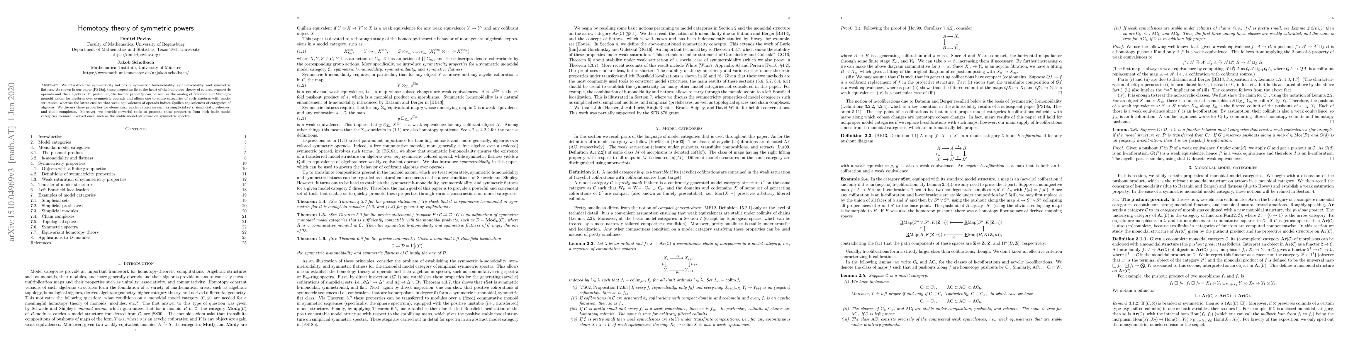We introduce the symmetricity notions of symmetric h-monoidality, symmetroidality, and symmetric flatness. As shown in our paper arXiv:1410.5675, these properties lie at the heart of the homotopy theory of colored symmetric operads and their algebras. In particular, the former property can be seen as the analog of Schwede and Shipley's monoid axiom for algebras over symmetric operads and allows one to equip categories of such algebras with model structures, whereas the latter ensures that weak equivalences of operads induce Quillen equivalences of categories of algebras. We discuss these properties for elementary model categories such as simplicial sets, simplicial presheaves, and chain complexes. Moreover, we provide powerful tools to promote these properties from such basic model categories to more involved ones, such as the stable model structure on symmetric spectra.