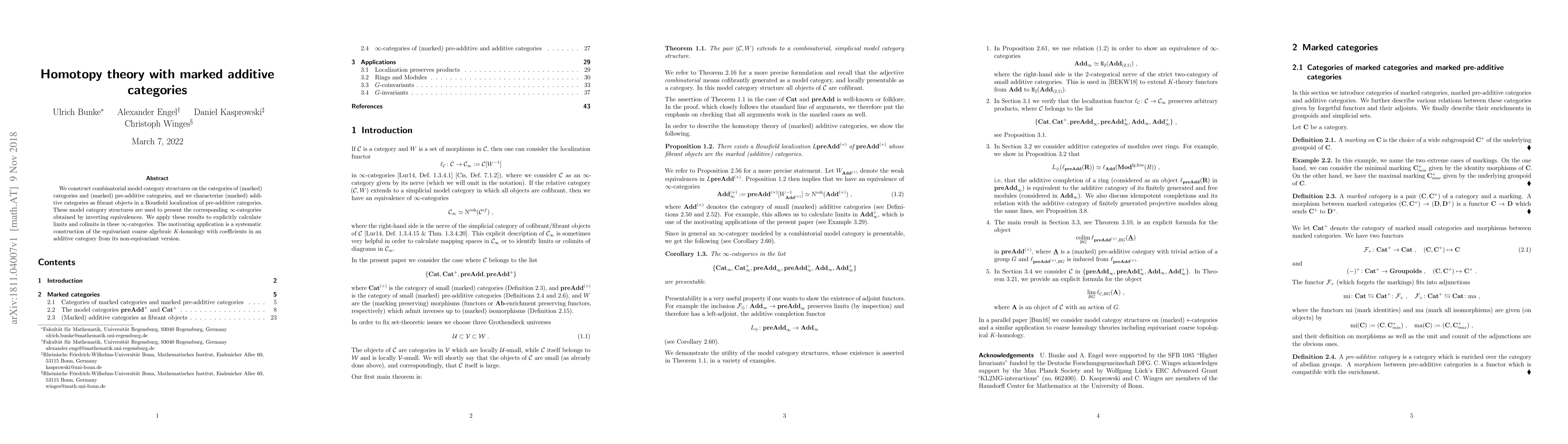 This paper constructs model category structures on marked additive categories and uses them to characterize these categories within a localized framework, presenting their corresponding $\infty$-categories and calculating specific limits and colimits.