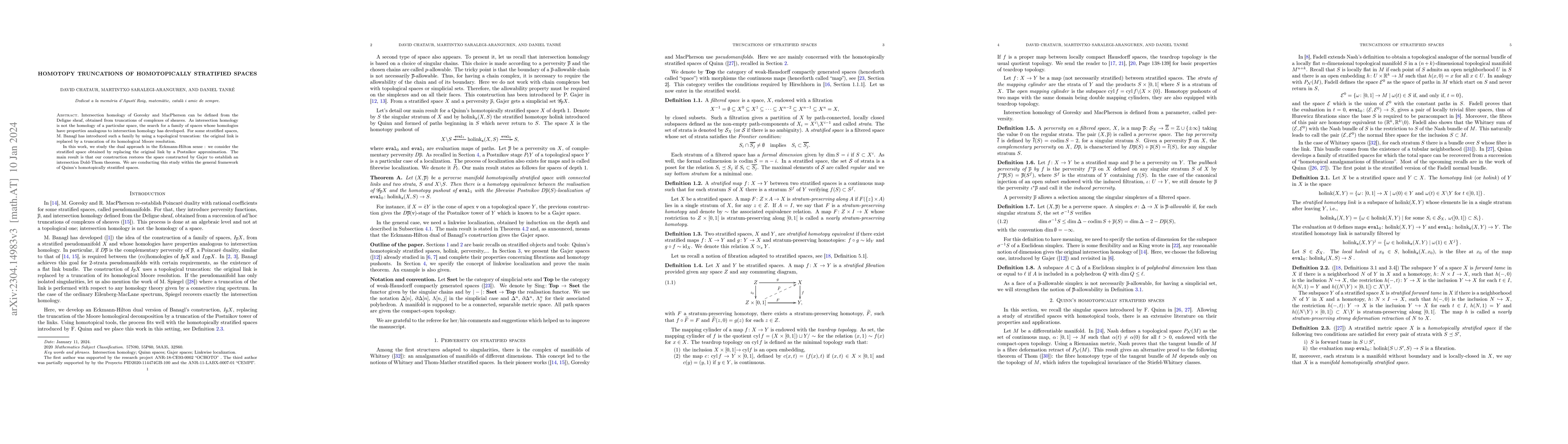 This paper explores homotopy truncations of homotopically stratified spaces by replacing original links with Postnikov approximations, demonstrating that this approach reconstructs Gajer's space and establishes an intersection Dold-Thom theorem within Quinn's framework.