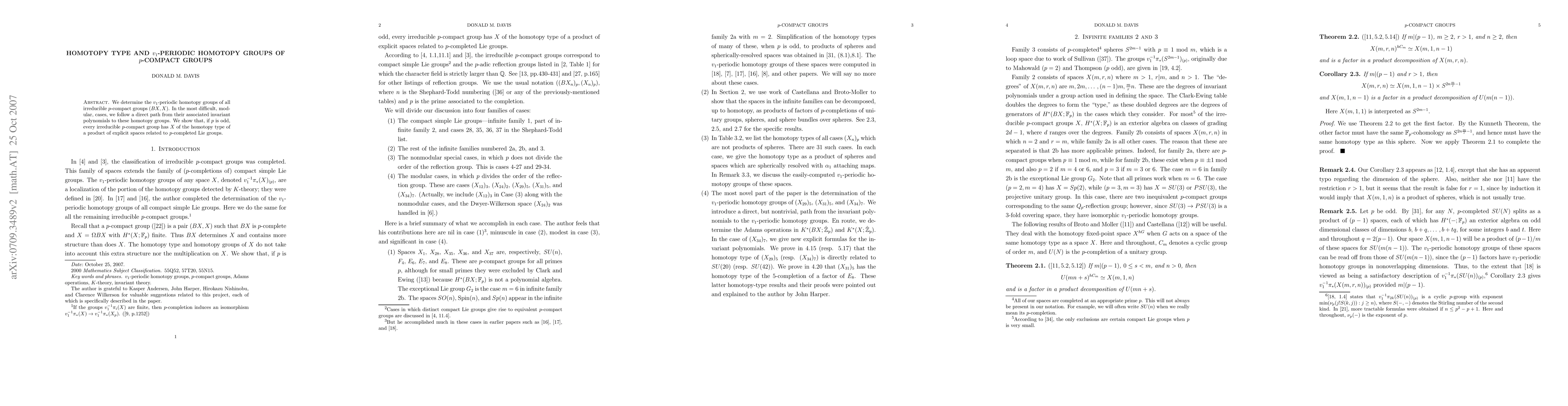 This paper determines the v1-periodic homotopy groups of irreducible p-compact groups, showing that, for odd primes p, these groups have a homotopy type akin to products of spaces linked to p-completed Lie groups, derived from their invariant polynomials.