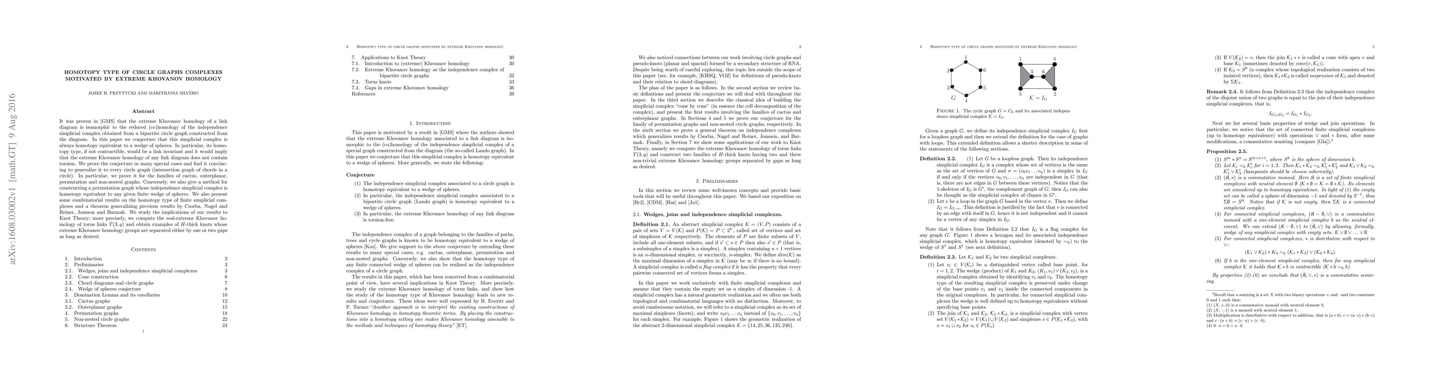 It was proven by Gonz\'alez-Meneses, Manch\'on and Silvero that the extreme Khovanov homology of a link diagram is isomorphic to the reduced (co)homology of the independence simplicial complex obtained from a bipartite circle graph constructed from the diagram. In this paper we conjecture that this simplicial complex is always homotopy equivalent to a wedge of spheres. In particular, its homotopy type, if not contractible, would be a link invariant and it would imply that the extreme Khovanov homology of any link diagram does not contain torsion. We prove the conjecture in many special cases and find it convincing to generalize it to every circle graph (intersection graph of chords in a circle). In particular, we prove it for the families of cactus, outerplanar, permutation and non-nested graphs. Conversely, we also give a method for constructing a permutation graph whose independence simplicial complex is homotopy equivalent to any given finite wedge of spheres. We also present some combinatorial results on the homotopy type of finite simplicial complexes and a theorem generalizing previous results by Csorba, Nagel and Reiner, Jonsson and Barmak. We study the implications of our results to Knot Theory; more precisely, we compute the real-extreme Khovanov homology of torus links $T(3,q)$ and obtain examples of $H$-thick knots whose extreme Khovanov homology groups are separated either by one or two gaps as long as desired.