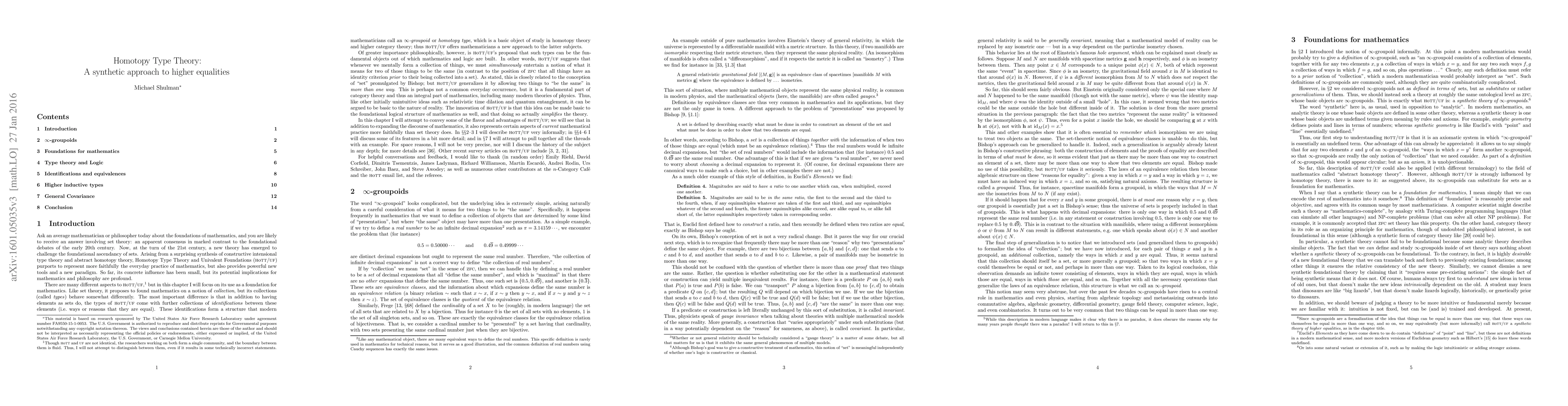 Summary: This chapter introduces Homotopy Type Theory and Univalent Foundations, providing a synthetic approach to higher equalities for philosophers, emphasizing the connections between type theory and homotopy theory in the context of mathematical foundations.