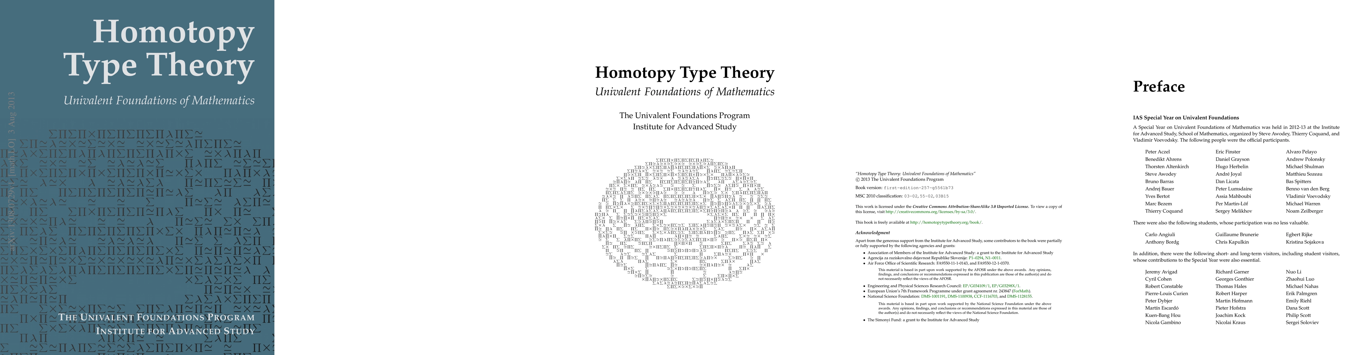 Homotopy type theory is a new branch of mathematics, based on a recently discovered connection between homotopy theory and type theory, which brings new ideas into the very foundation of mathematics. On the one hand, Voevodsky's subtle and beautiful "univalence axiom" implies that isomorphic structures can be identified. On the other hand, "higher inductive types" provide direct, logical descriptions of some of the basic spaces and constructions of homotopy theory. Both are impossible to capture directly in classical set-theoretic foundations, but when combined in homotopy type theory, they permit an entirely new kind of "logic of homotopy types". This suggests a new conception of foundations of mathematics, with intrinsic homotopical content, an "invariant" conception of the objects of mathematics -- and convenient machine implementations, which can serve as a practical aid to the working mathematician. This book is intended as a first systematic exposition of the basics of the resulting "Univalent Foundations" program, and a collection of examples of this new style of reasoning -- but without requiring the reader to know or learn any formal logic, or to use any computer proof assistant.