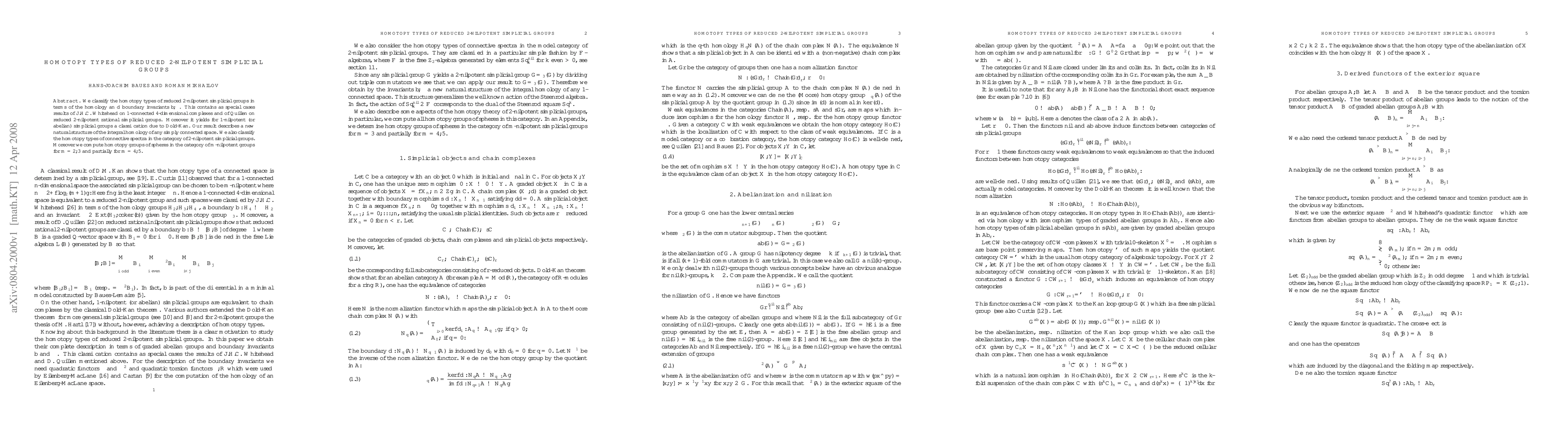 We classify the homotopy types of reduced 2-nilpotent simplicial groups in terms of the homology an d boundary invariants $b,\beta$. This contains as special cases results of J.H.C. Whitehead on 1-connected 4-dimensional complexes and of Quillen on reduced 2-nilpotent rational simplicial groups. Moreover it yields for 1-nilpotent (or abelian) simplicial groups a classification due to Dold-Kan. Our result describes a new natural structure of the integral homology of any simply connected space. We also classify the homotopy types of connective spectra in the category of 2-nilpotent simplicial groups. Moreover we compute homotopy groups of spheres in the category of $m$-nilpotent groups for $m=2,3$ and partially for $m=4,5$.