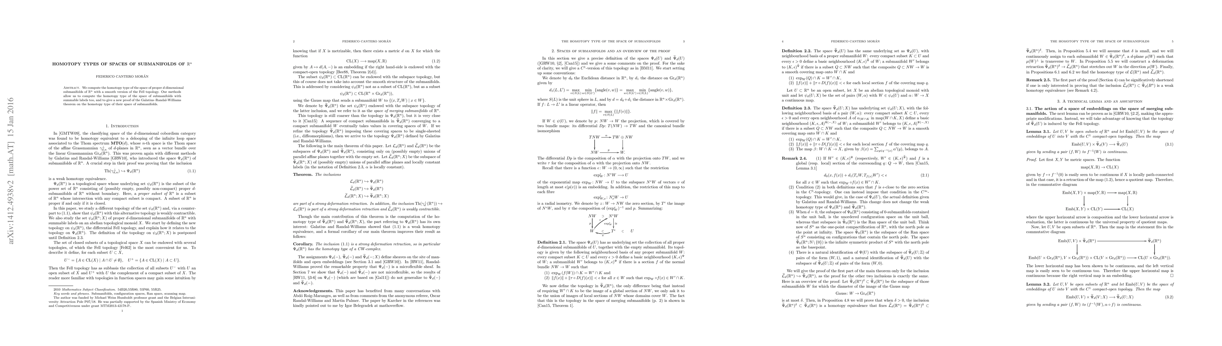 This paper computes the homotopy type of the space of proper d-dimensional submanifolds in ${\mathbb R}^n$ using a smooth Fell topology, extending the analysis to submanifolds with summable labels and providing a new proof for the Galatius--Randal-Williams theorem.