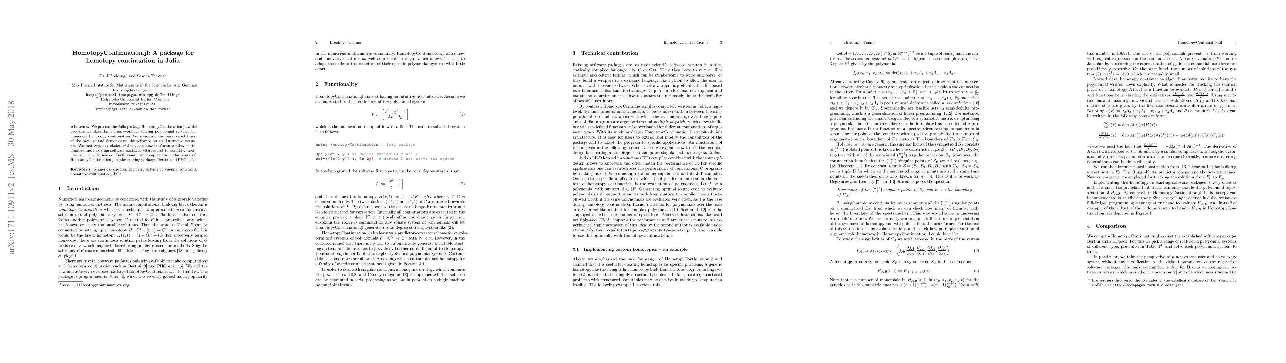 HomotopyContinuation.jl is a Julia package designed for solving polynomial systems via numerical homotopy continuation. It offers enhanced usability, modularity, and performance compared to existing tools like Bertini and PHCpack, leveraging Julia's features.